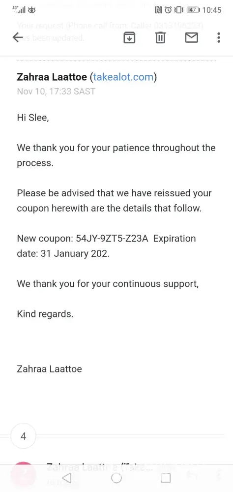 finally received my coupon back, which i used to purchase a few items, i still had R400 and some change left as the stand was a 1000. i sent email regarding the remainder of the funds, and i was told since i didn't use the whole amount, it has fallen off, so i cannot use it any longer and the is nothing they can do.