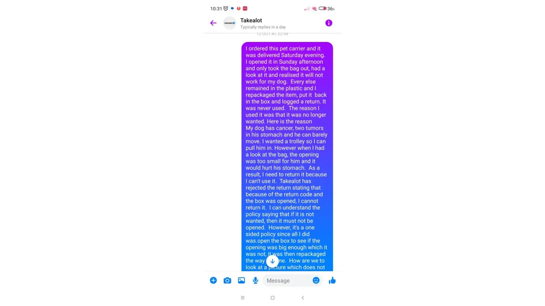 My dog has cancer and I am unable to leave the house hence I have been shopping online via TakeAlot. I purchased a pet carrier as I thought it would be convenient to put my dog in since he can hardly walk. The pet carrier was delivered on sat evening 7 oct 2023 and I opened the item seal on 8 oct 2023 at 3pm to view it. I only had a look at the bag with all the other accessories still in their packaging. Upon viewing the bag, I realized that the opening is too small for my dog even though the description on the website said its for a large dog (I had a look at the reviews on 17 oct and others have complained that it is not for a big dog as well). I put it back in its packaging and logged a return under the same product return code that I have returned many opened items for which I was refunded. The item was not used at all, only viewed. The item was returned and they declined my refund stating the seal was broken. I phoned customer service a few times as well as asked to speak to a manager, who by the way, was the most rudest manager I ever dealt with and pity that TakeAlot does not know anything about customer service. The item has now been returned back to me today with very untidy repacking so I am sit even sure of they returned a brand new product to me. They are being spiteful as I have recently retuned quite a few items as I a dependent on online shopping as I am unable to leave the house due to my sick pet and as a result. I have returned quite a few items under the same return code for which it was accepted however they are now applying inconsistent policies and I should not be forced to keep a item I did not use and cannot use because the tape was opened.