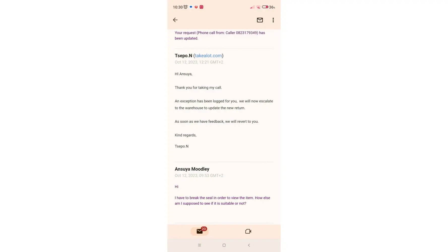 i ordered 2 items on takealot the 1 was wrong i than called and requested the order to be cancelled next thing its being delivered i than reject the delivery and the driver refuses i call and they than request a collection after 5+ calls to them fine it gets collected and states to be refunded now i get an email saying they sending me a replacement i than call again saying i did not request a replacement and get the run around again saying wait for sms than call us again to cancel the order i mean going for a week now trying to get a refund on one item and still not getting help what do i do please i call again and request to speak to a manager i get told they can only send an email for a manager to call me next week this is really fustrating and unhelpful