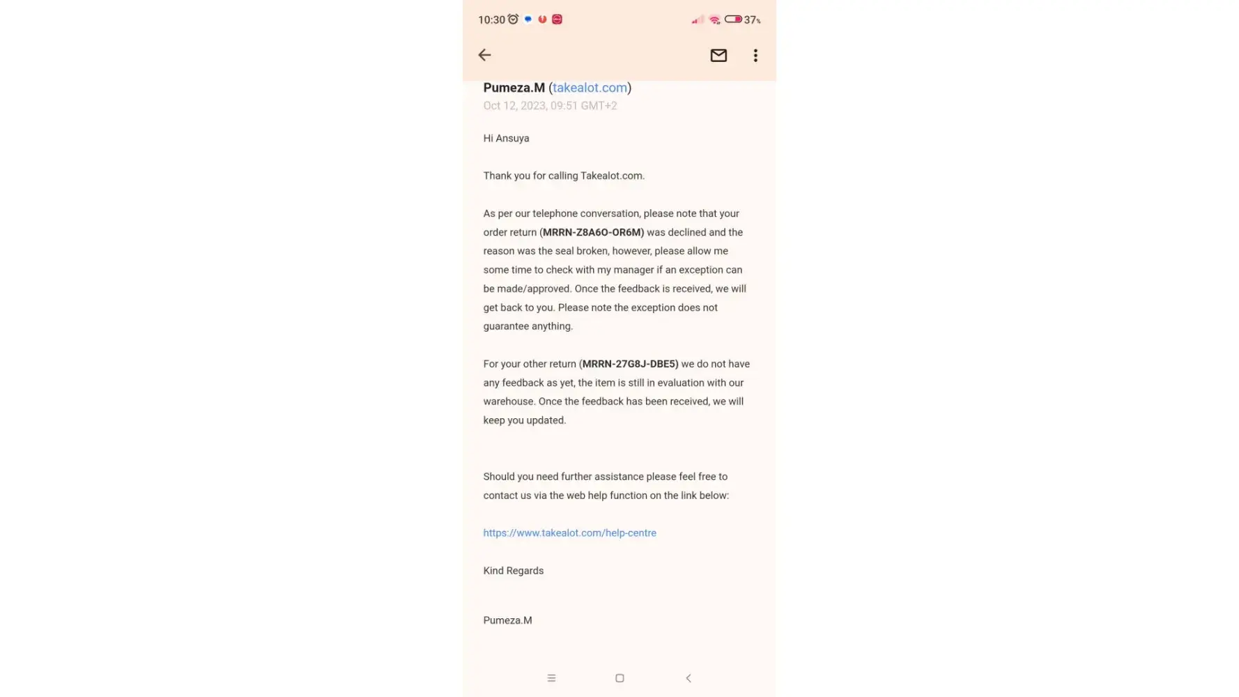 So yes, I scheduled the return because I spoke to Mr. ***********, and trust me when I say this, I was willing to spend money in the future and provide your company with continuous support from my side. But I promise you I will head and warn anyone who wishes to join Takealot to NEVER purchase from you again.