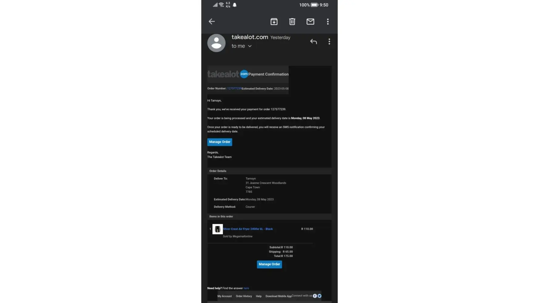 On the 25 April 2023 I placed an order with Takealot. Paid via Instant EFT with PayFast. Days passed without anyone knowing where my money is. On the 3rd of May - PayFast sent me a payment confirmation email, which I then forwarded to Takealot.