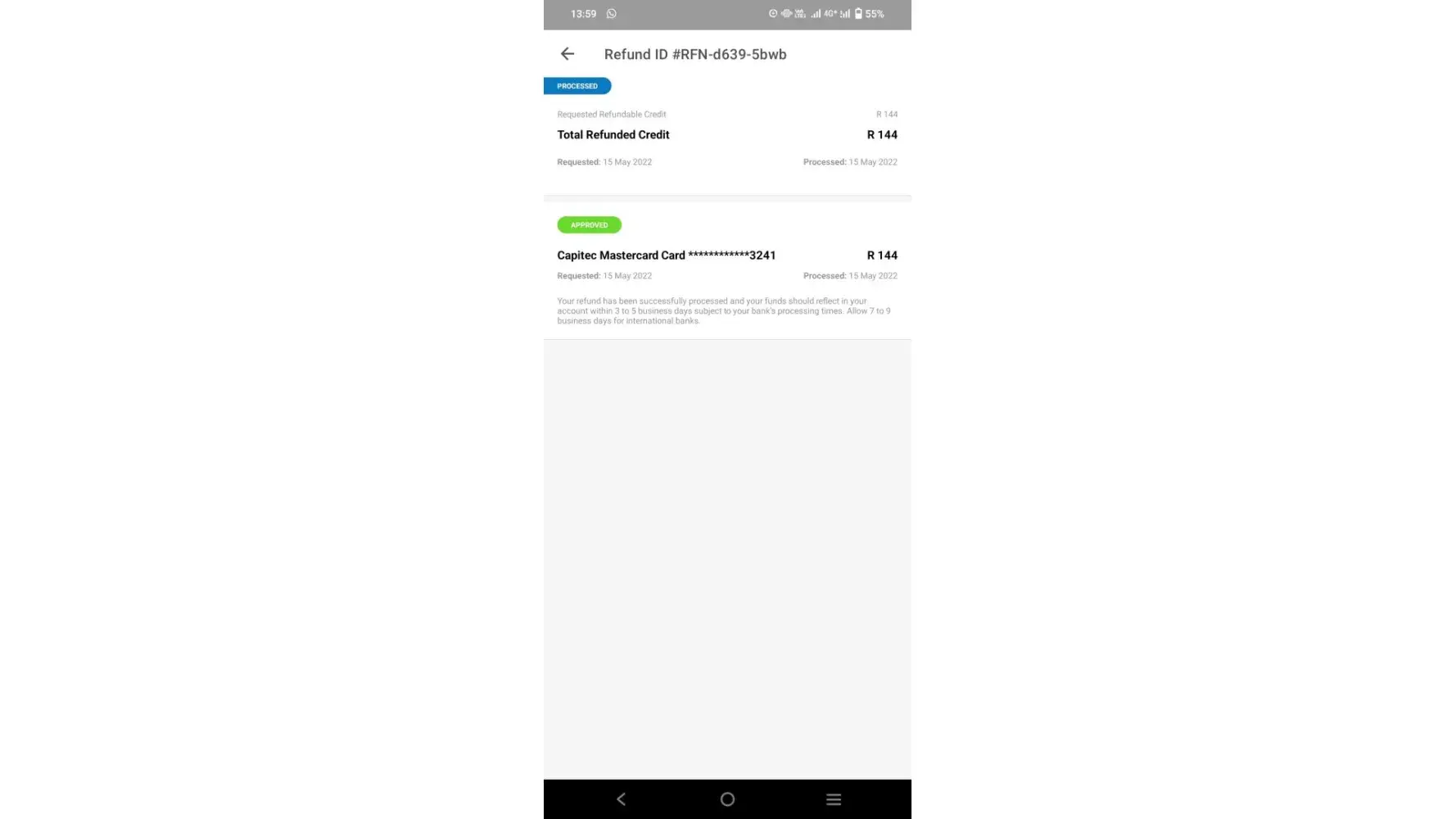 I have two refunds which has not been refunded to my account of 01 December 2022 and 15 May 2022. I have two refunds which I did not receive yet, RFN-d639-5bwb and RFN-856m-mbz3. I would kindly like to know when will I receive the refund. Good day, RFN-d639-5bwb has been requested and processed on 15 May 2022. I have not received the refund as well as refund RFN-856m-mbz3 has been requested and processed on 1 December 2022 and it has been approved by Payflex