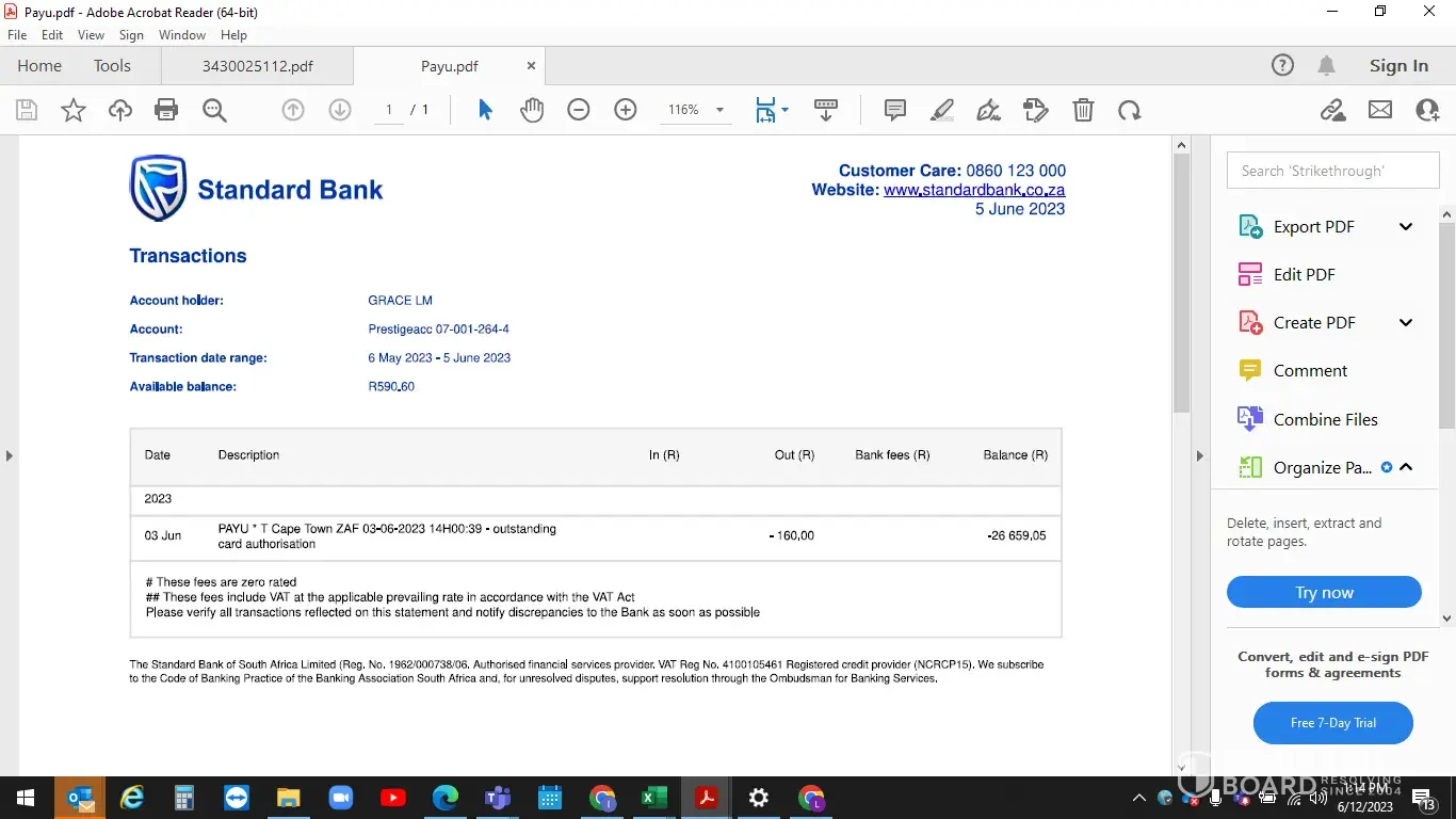 Payment R512 (R352 Discovery Miles R160 Standard Bank 3 June.