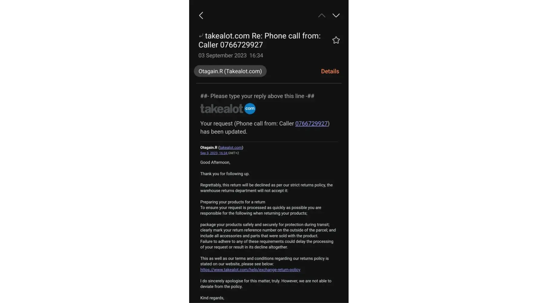 If you need further assistance give us a call on [protected]; or email [protected]@takealot.com.