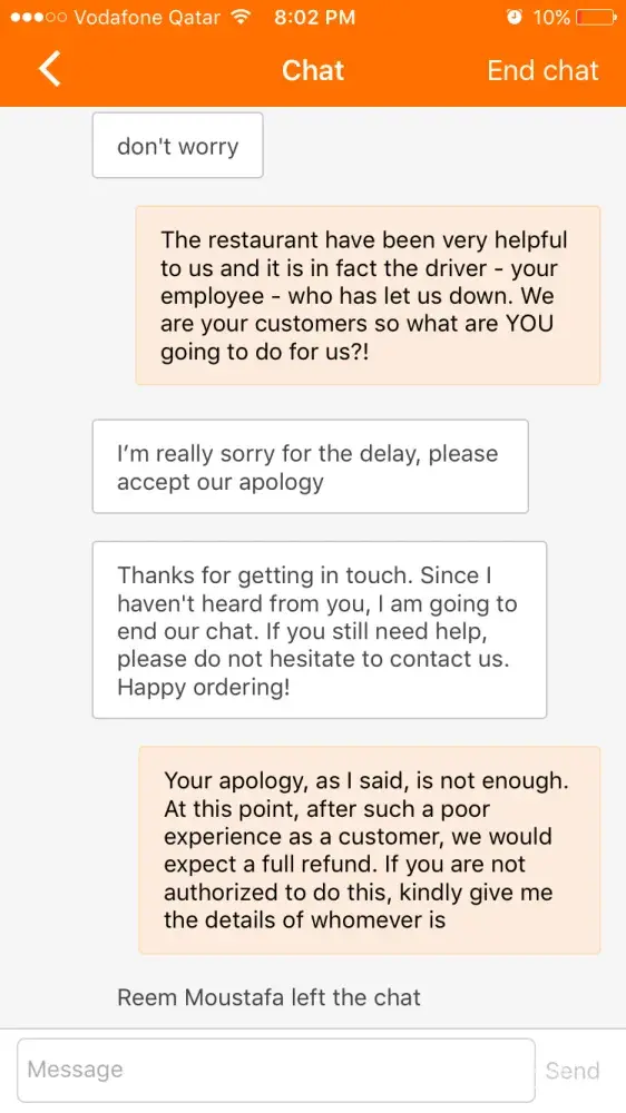 We received our order 2 HOURS after placing it. The restaurant offered to send us a free order with their own driver, whilst the talabat employee we spoke to - Reem Moustafa- LEFT THE CHAT when we were trying to speak to him. This is rude, unhelpful and just topped off a very poor experience. We would expect a full refund for this order and look forward to a prompt response to this message.