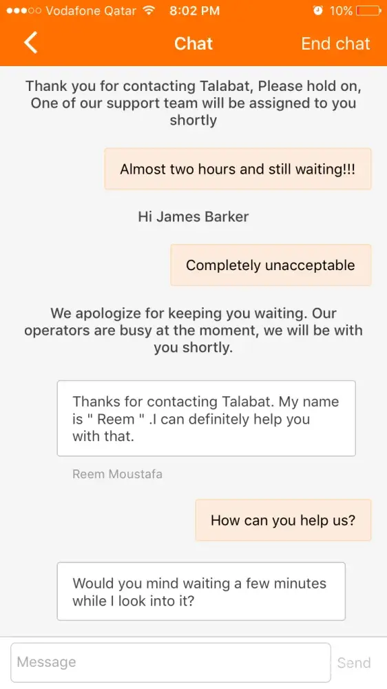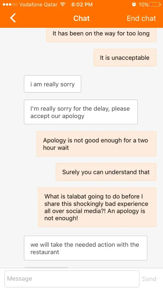 Is this type of people who talabat has in their live chat?pathetic this is the first ever arrogant irresponsible chat i had with talabat and hope they address it correctly