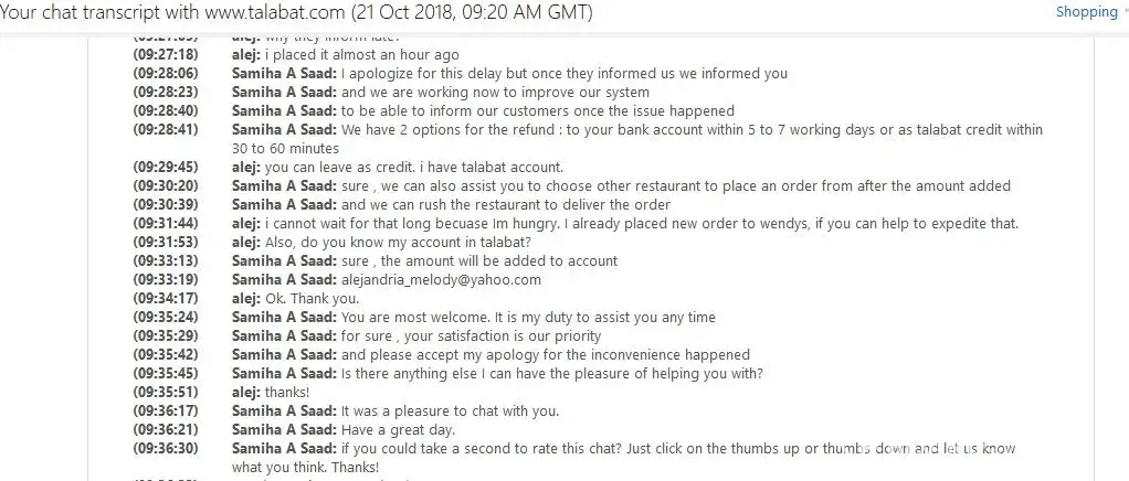 Hoda A El-SayedThank you for contacting Talabat customer care, my name is Hoda.