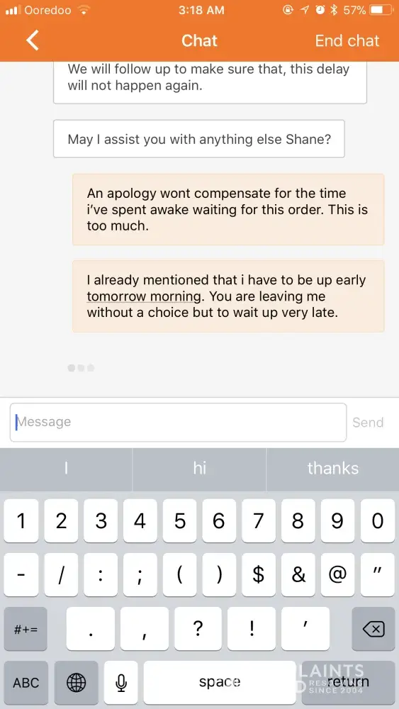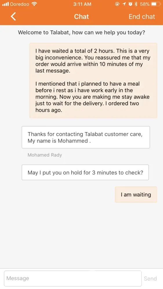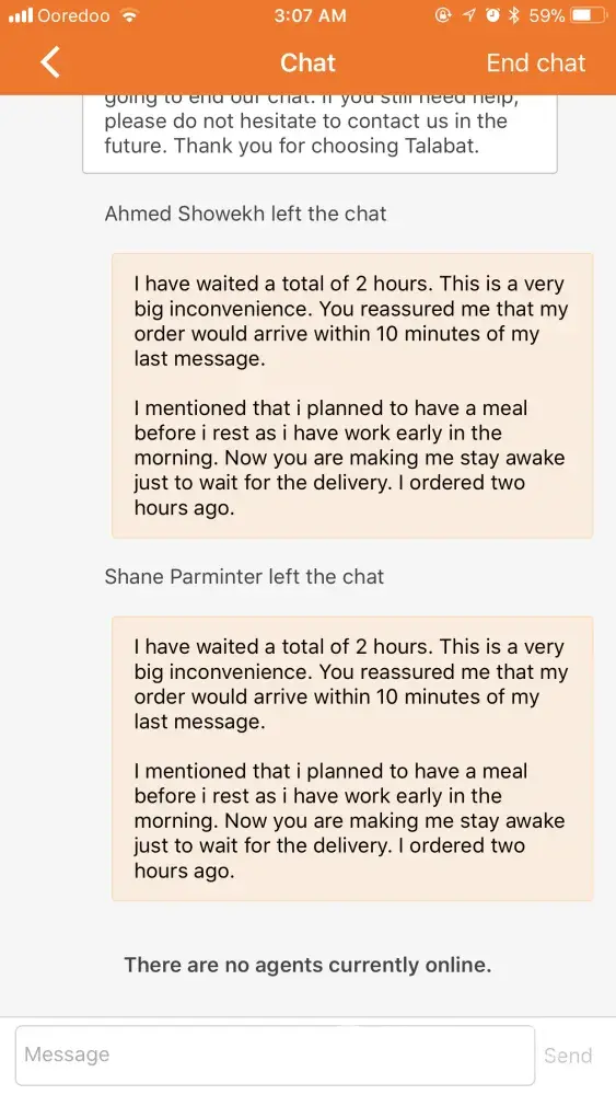 Once an agent became available, I told them I had waited for 2 hours, told them of the inconvinience, mentioned that they reassured me of my order and to wait 10 minutes after my last message and told them they are keeping me awake having to wait for two hours even though I have to wake up early for work.