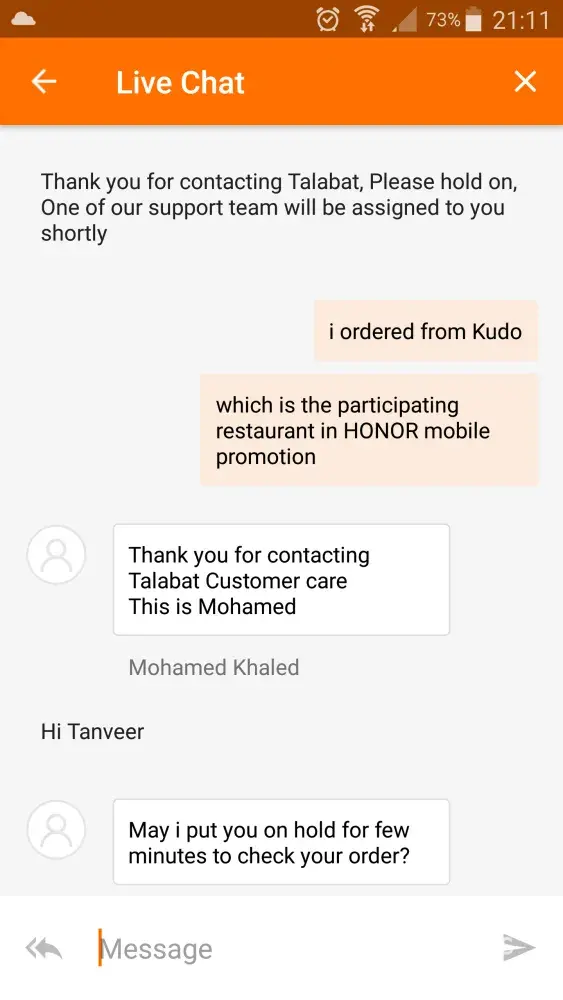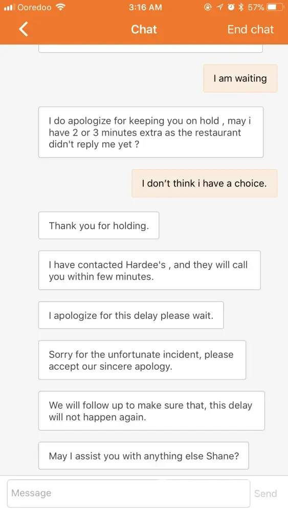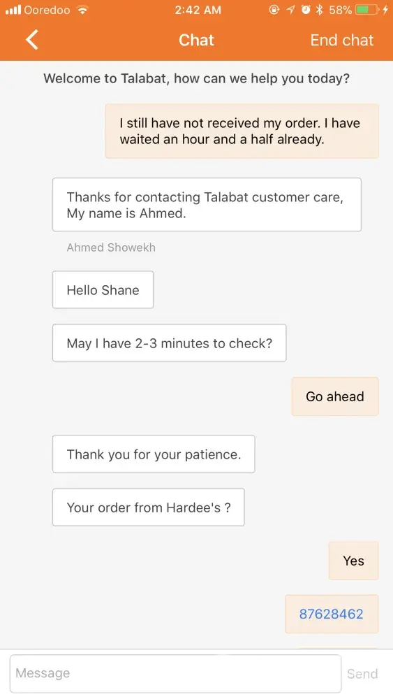 I waited for another half an hour and still did not receive the order. Again, I messaged an agent.