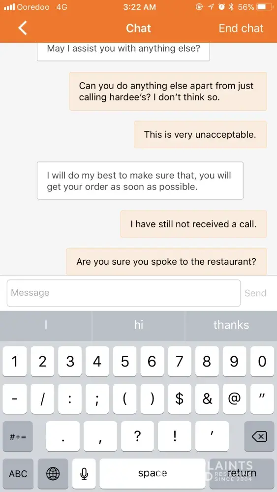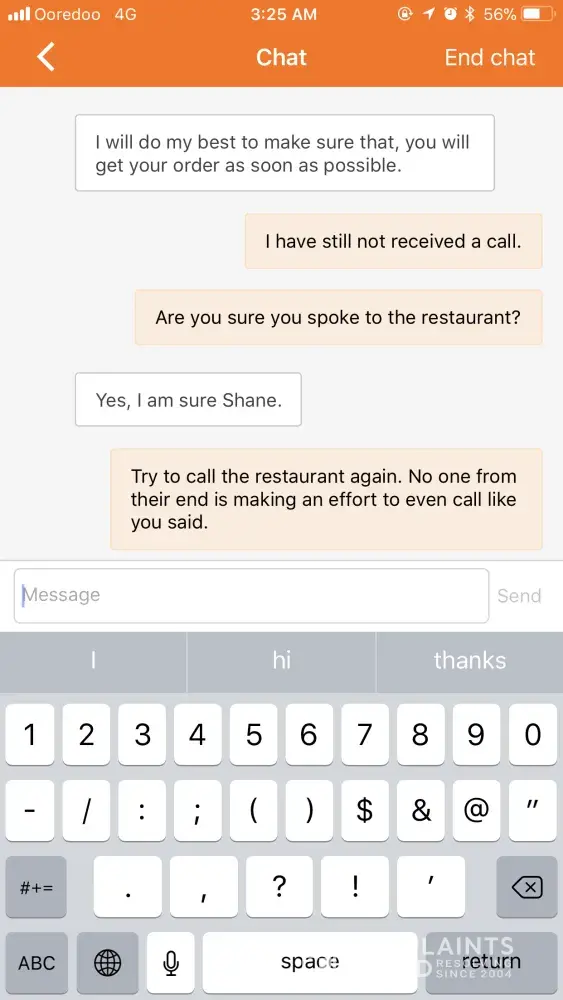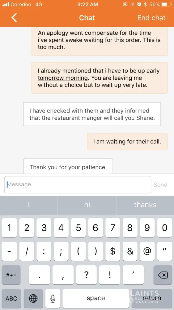 I messaged again saying that I still did not receive either the order or a call from the restaurant manager.