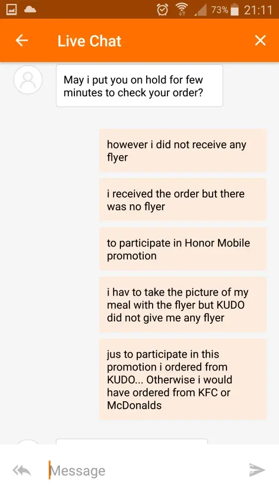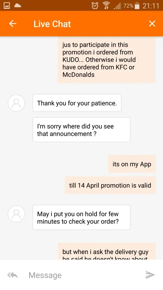 I attached photos of my order receipt, meal, promotion and screenshot of the live chat which I had.