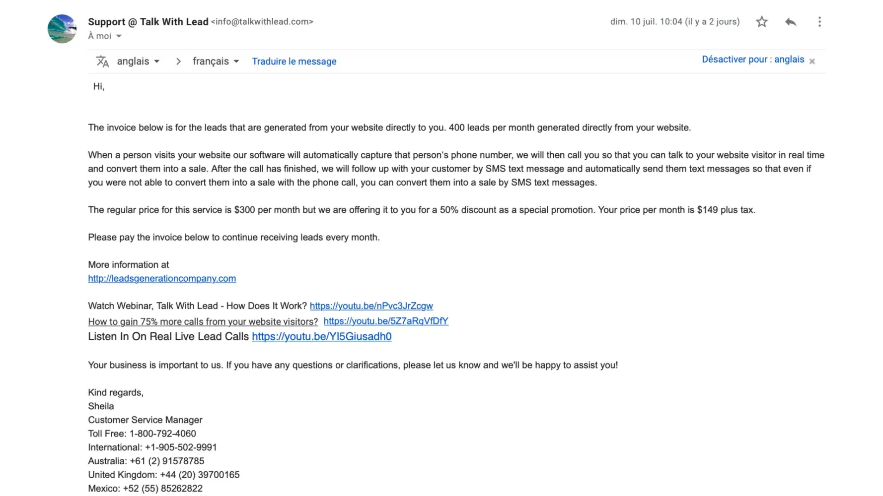 Talks with Leads is shamble of a scam. I have Received emails… my Account has been closed & satisfied. However, this company began sending me emails that I have a balance of $168.35 due for leads generator… (April-June) stopped, after I responded with issue addressing emails & images of the balance satisfied & closed. Now I’ve recently began receiving emails again (November) “Hmm 🤔†from a different address. There is not a account number on the email, only an amount of $168.35 and the suggestion to pay the invoice.
