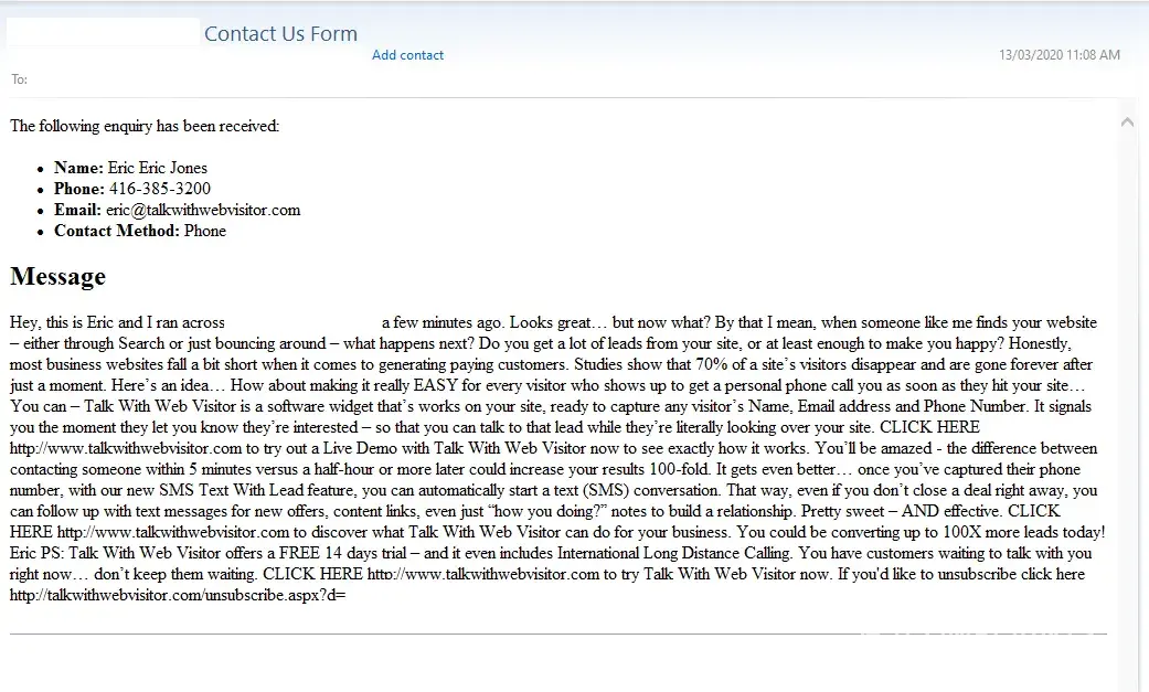 Bunch of spammers hacking my website's contact form. No way I would ever do business with people like that. Stupidity at its worst.