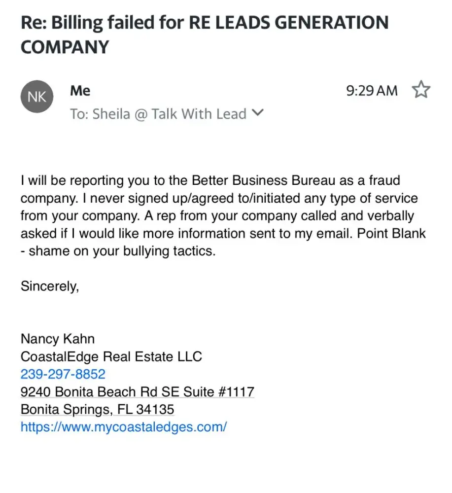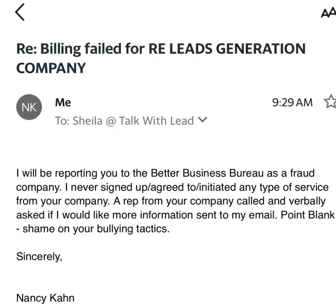 Unlawful credit card transaction and receiving threatening emails from Talk with Lead