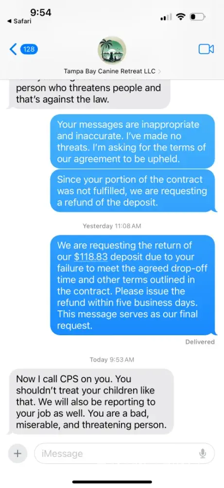 I booked boarding for my two dogs with Tampa Bay Canine Retreat LLC and paid a deposit to reserve specific dates. Our contract listed a 6:30 AM drop‑off time. My husband arrived at that time, but no one answered the door. I contacted the business at 6:48 AM, and they did not respond until 7:00 AM. Their first message referenced an incorrect balance, and...