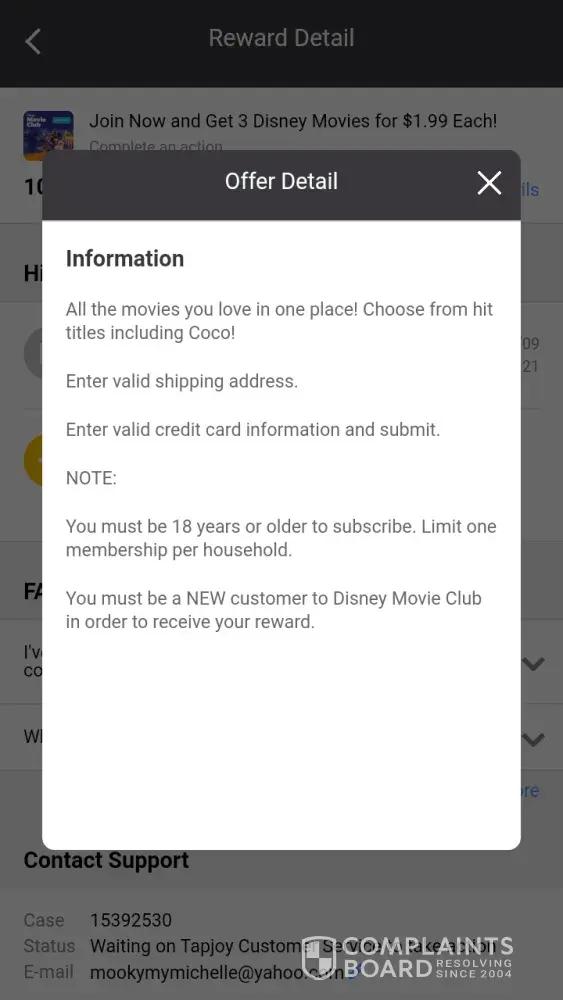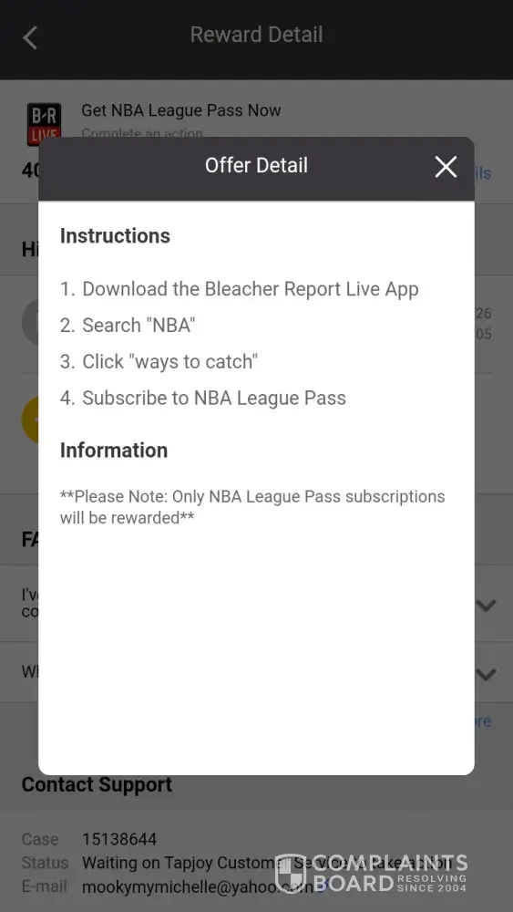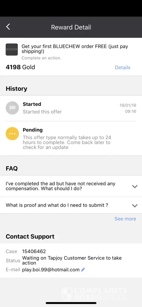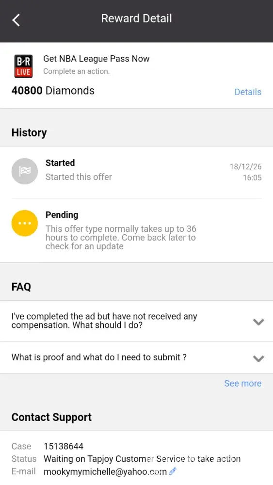 Since then, I have not received any contact. I attempted to contact again by replying to one of the emails they sent, as the offer for that game had been removed from my tapjoy account in my game — it was not listed as rewarded or not rewarded, it was just removed, along with many other unrewarded, incomplete offers. That email also went unanswered.