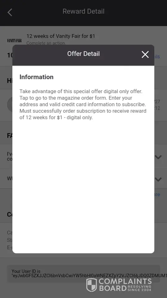This is the same one I'm having issues with. Still haven't received my diamonds for the Vanity Fair offer. And it's like no other way to get in contact with someone to help just dead ends. It's frustrating.