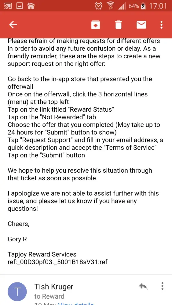 So I submit a ticket for four offers I completed and tapjoy sends me this messag