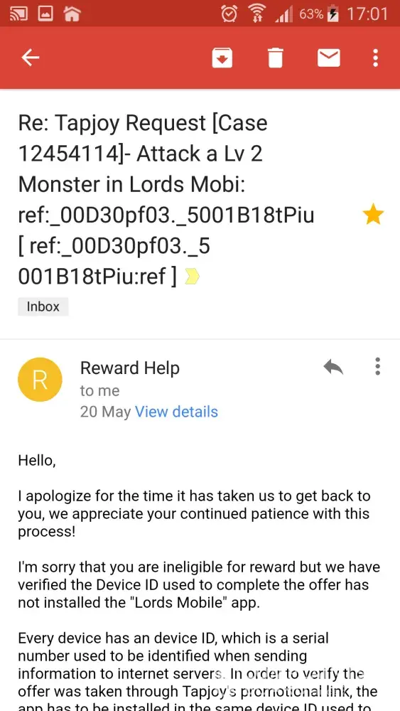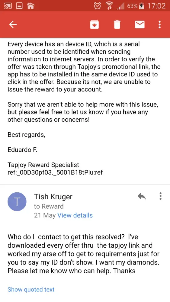 I, like many users have played various apps and have used their in app provider to earn currency to play the game. Tapjoy is one provider that consistantly fails to honor it's contract with players once they follow their promotions to earn in app currency. I have noticed when it comes to doing various things to earn this currency, if the payout is a small amount, you are more then likely to get the reward, but if the amount is large, your chances of receiving the reward is pretty slim. I have had 2 open tickets with this company, and if they don't ignore your ticket and close it, then they give you various excuses as to why it will not be honored. One of my tickets, I was told the app was not installed on my device. I then provided shots of the device with the app clearly installed and listed in the application manager. I was then told I did not download the app via THE LINK THEY PROVIDE. I then provided screenshots from the app that clearly shows there is NO LINK provided by them in which I can click and download the app. The next followup email told me my device ID had changed. This is what their email said.