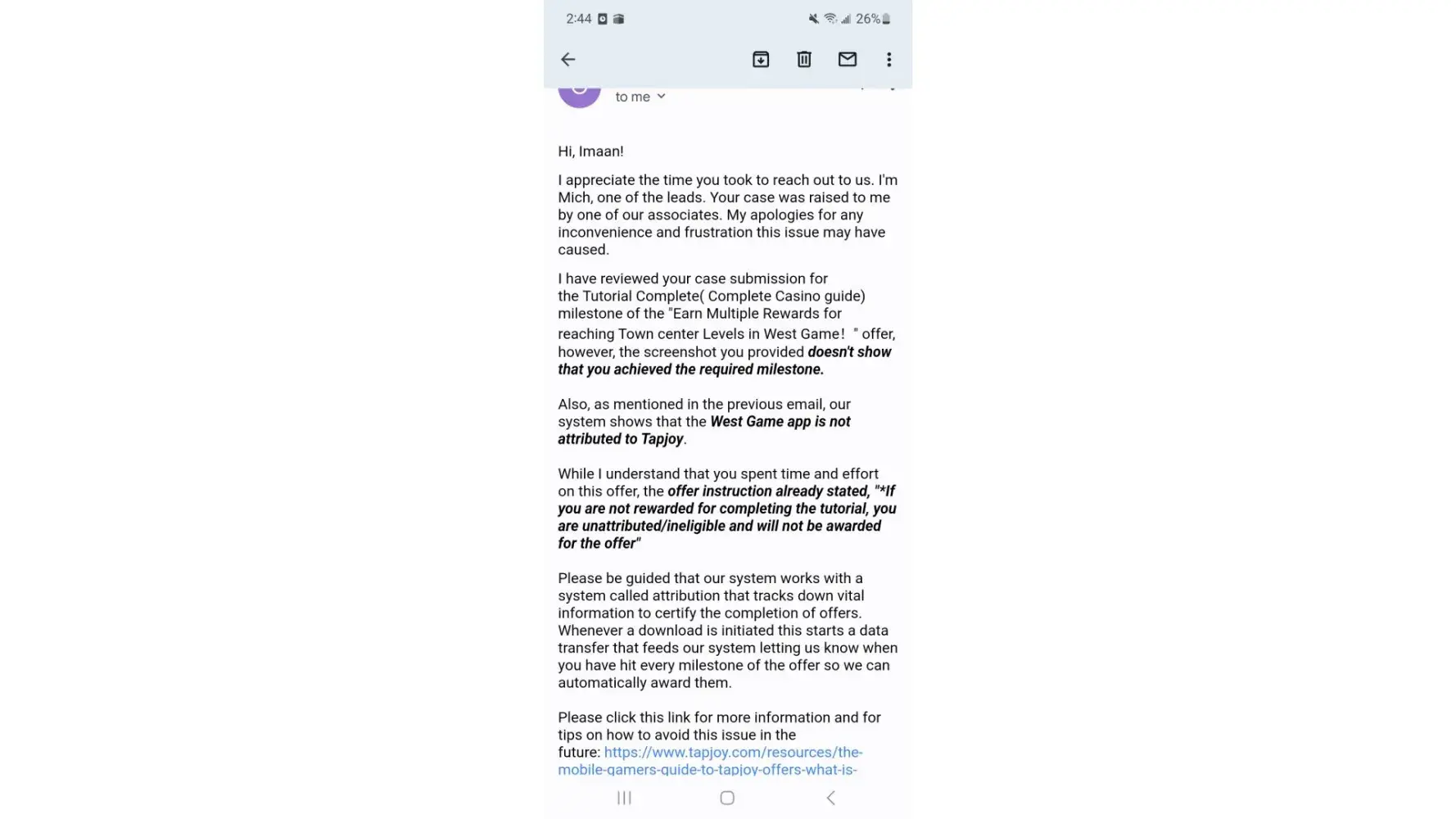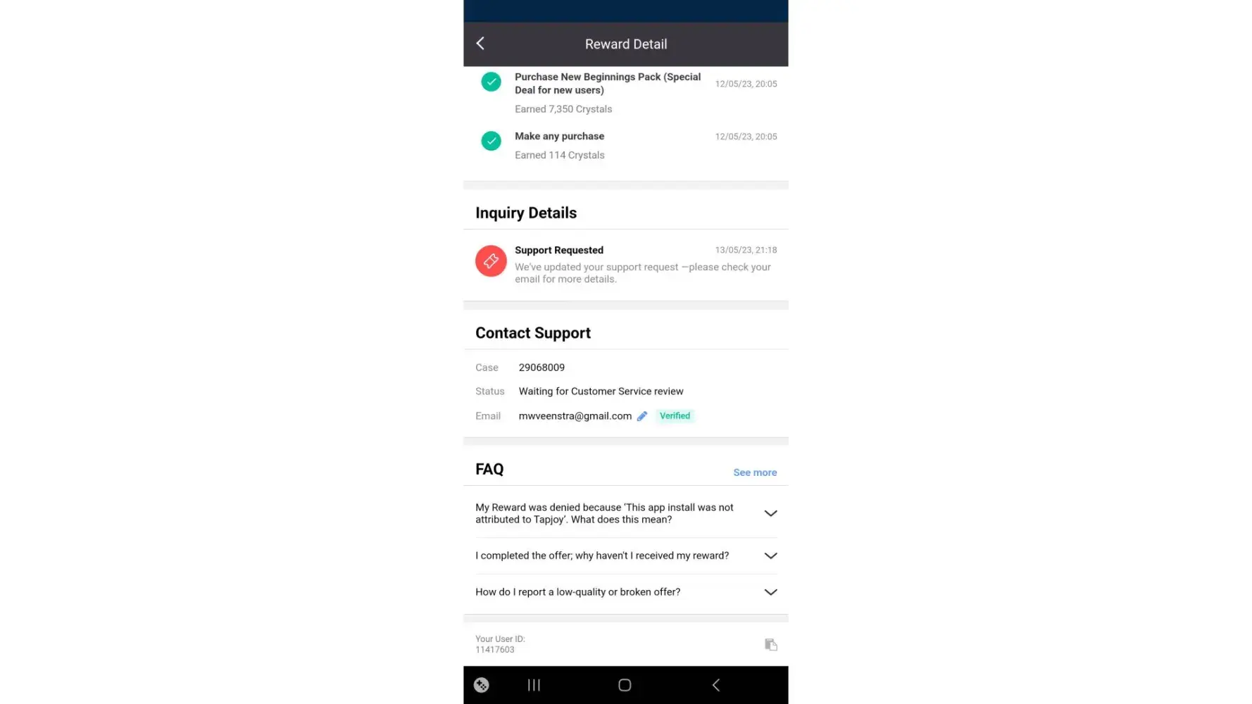I have reached out in abundance providing evidence of offer validity and completion, with evidence being deliberately overlooked and outright ignored by Tapjoy. Support cases are opened by customer (myself), marked "under review" by Tapjoy, and then dismissed via automated message by Tapjoy due to unfounded claims of illegitimacy with cases being marked as "closed: resolved" by Tapjoy despite no resolution being reached.
