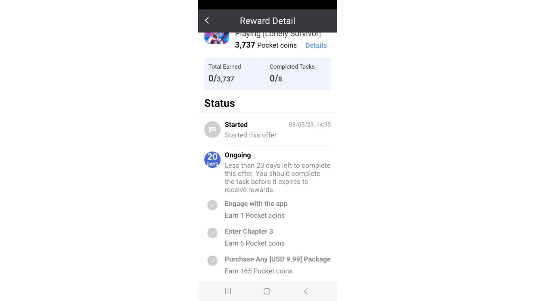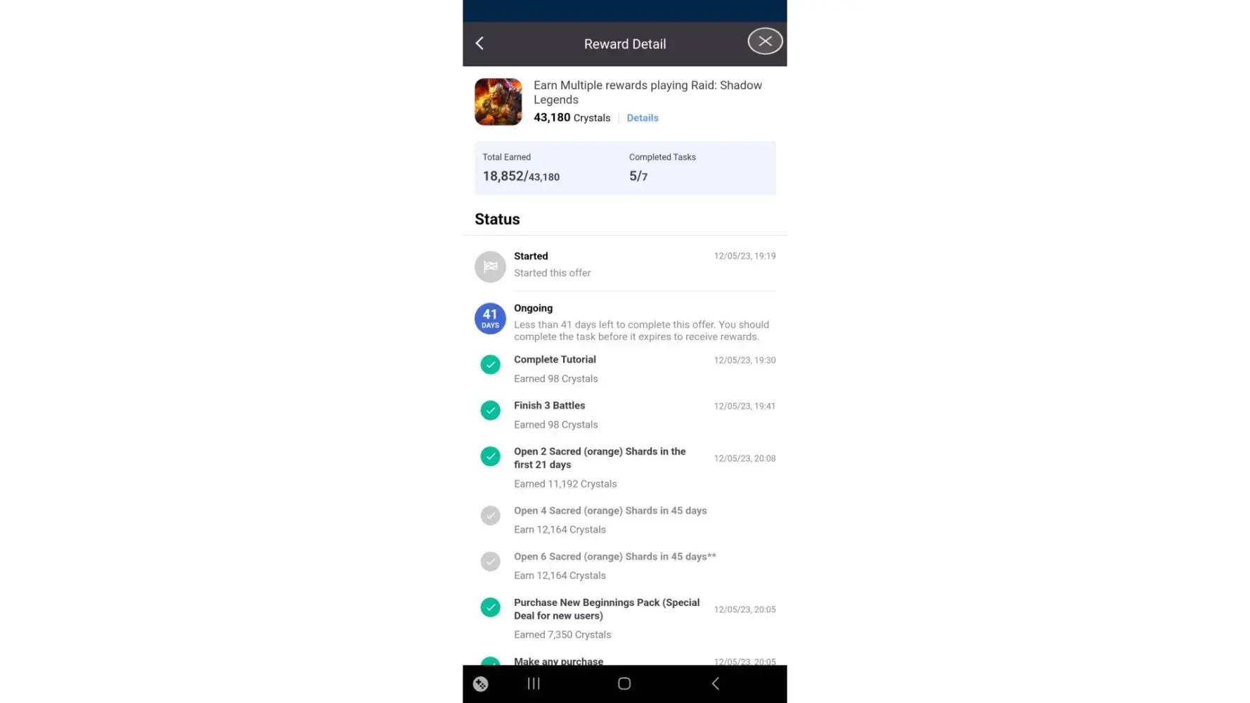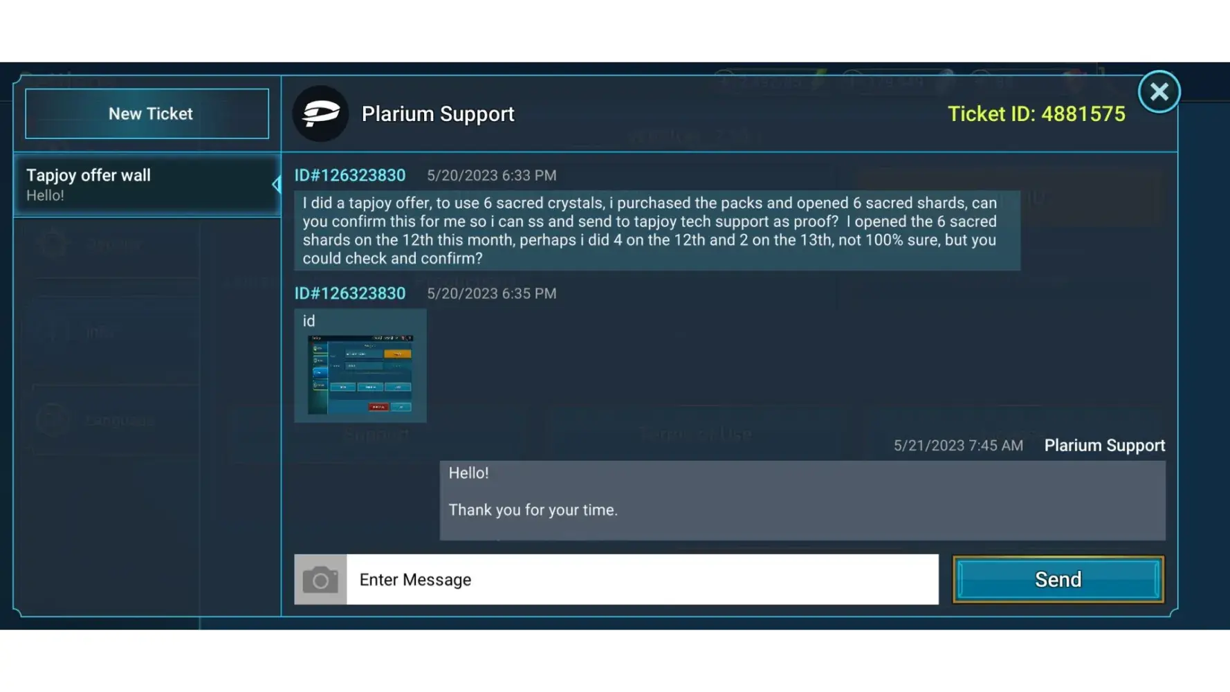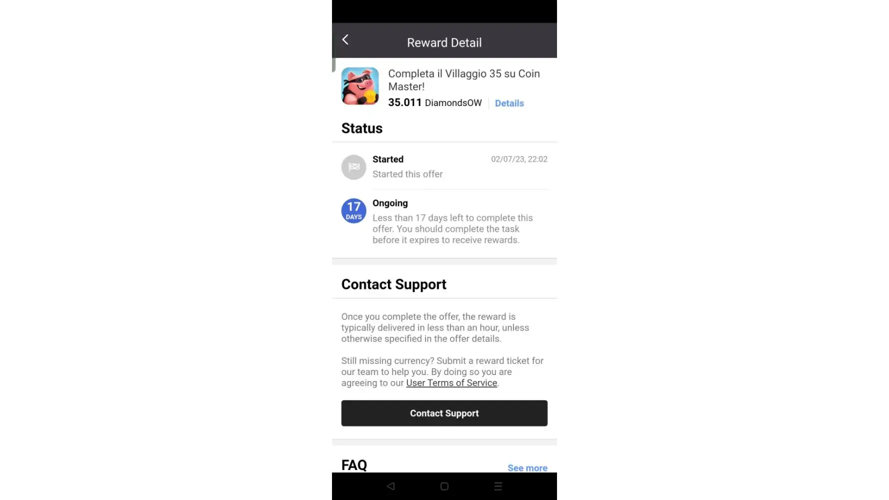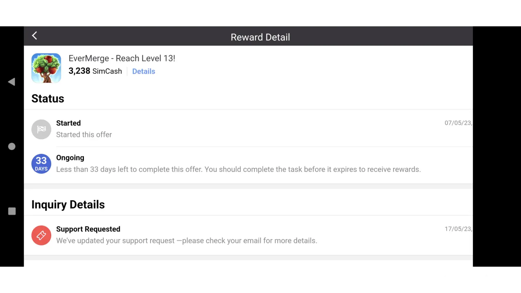 When I checked in on my progress I saw that I hadn't received even the first reward for downloading the game, nor the 2nd reward I had earned. So I submitted a ticket, with proof that I had indeed started the offer and downloaded the game. They requested additional proof so I submitted 2 more screenshots of my user info.