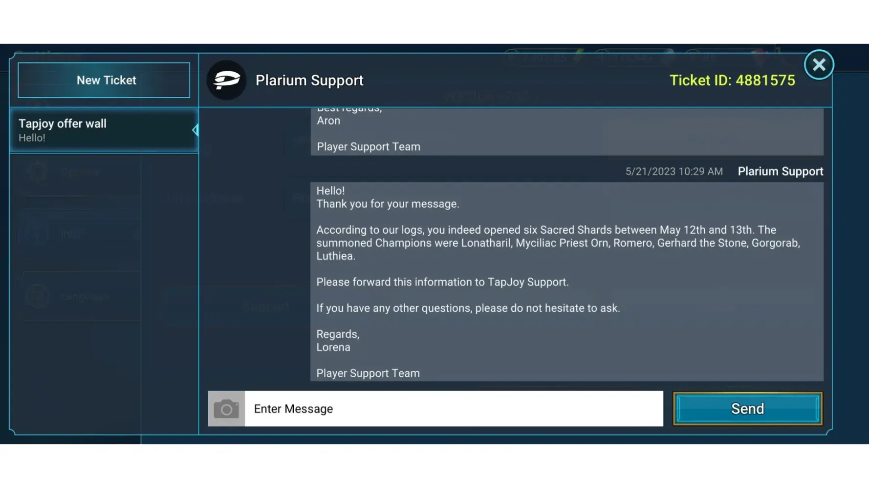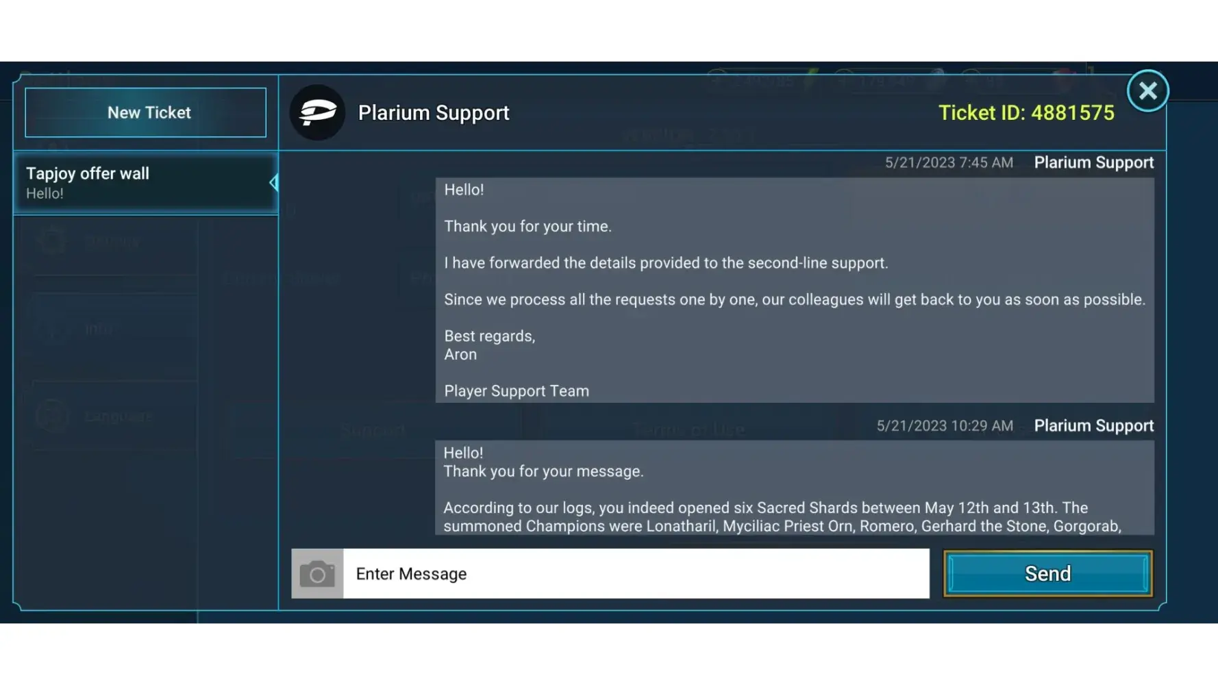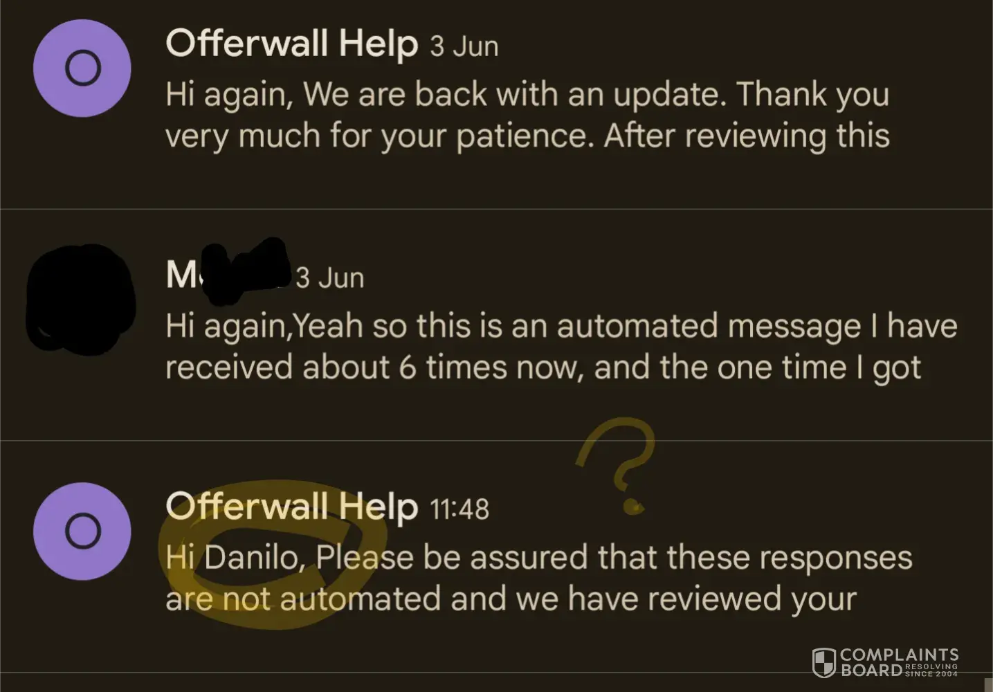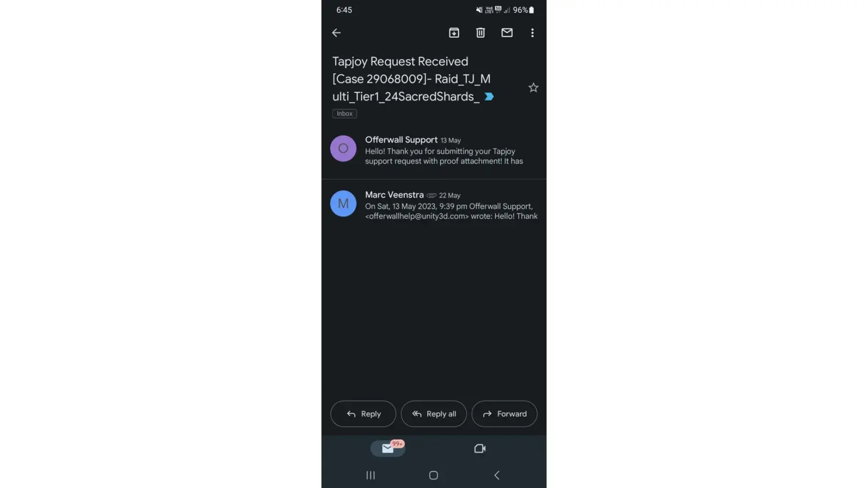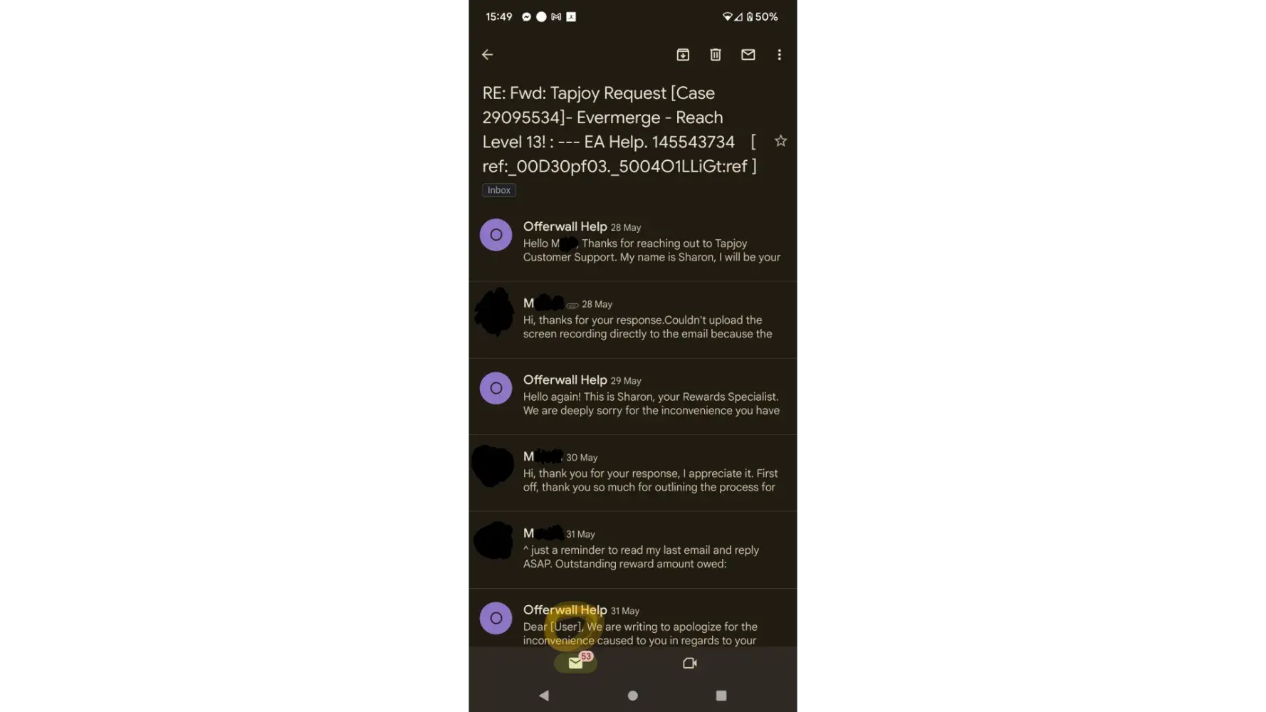 Further attachments were supplied in the form of asking for confirmation from TapJoy, with one image reading "prove you read the entire [email] chain by quoting the 9th and 10th words from the email I sent to you on the 28th May (email #2 in this thread)", and unsurprisingly no acknowledgement was received. This confirms what I already predicted to be true - that Tapjoy does not review evidence supplied by customers in opened support cases and instead closes cases without resolution or fulfilment of their promises. Adding to this, email responses from TapJoy have been sent to myself with the incorrect name listed. My name is visible on my email, on my TapJoy account and on my email signature, but it is frequent wherein emails will be received addressed to different names. This, in turn, shows Tapjoys' customer support is imprecise and faulty, alongside potentially dangerous sharing of users privacy information amongst their database.
