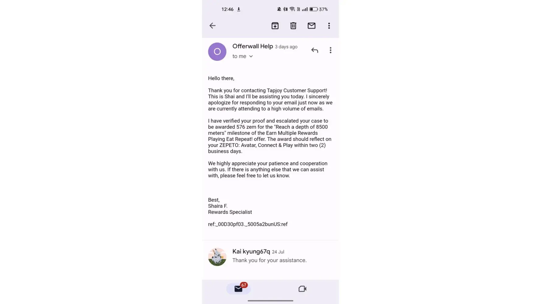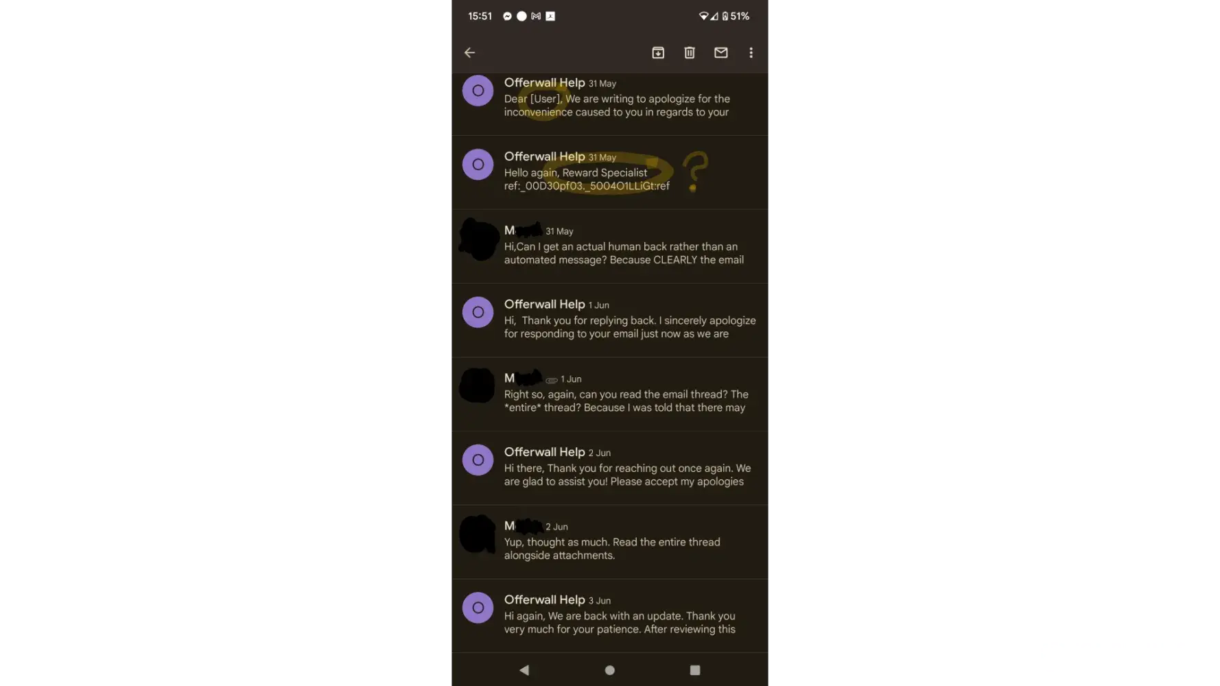 Further attachments supplied in the form of asking for confirmation from TapJoy, with one image reading "prove you read the entire [email] chain by quoting the 9th and 10th words from the email I sent to you on the 28th May (email #2 in this thread)", and unsurprisingly no acknowledgement was received. This confirms what I already predicted to be true - that Tapjoy does not review evidence supplied by customers in opened support cases and instead closes cases without resolution or fulfilment of their promises. Adding to this, email responses from TapJoy have been sent to myself with the incorrect name listed. My name is visible on my email, on my TapJoy account and on my email signature, but it is frequent wherein emails will be received addressed to different names. This, in turn, shows Tapjoys' customer support is imprecise and faulty, alongside potentially dangerous sharing of users privacy information amongst their database.