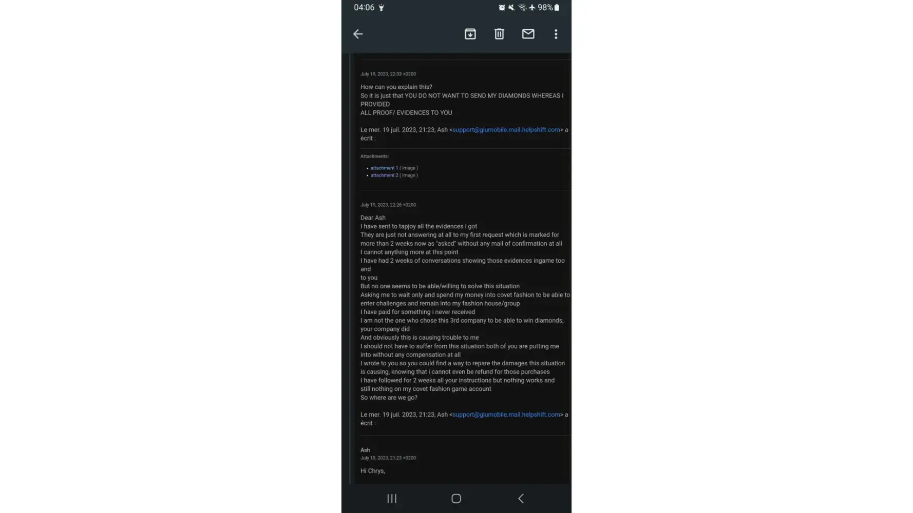 Desired outcome: Recevoir ce pourquoi j'ai payé, vous me devez 20.000 diamants depuis le 6 juillet et n'avez jamais traité mes 2 réclamations