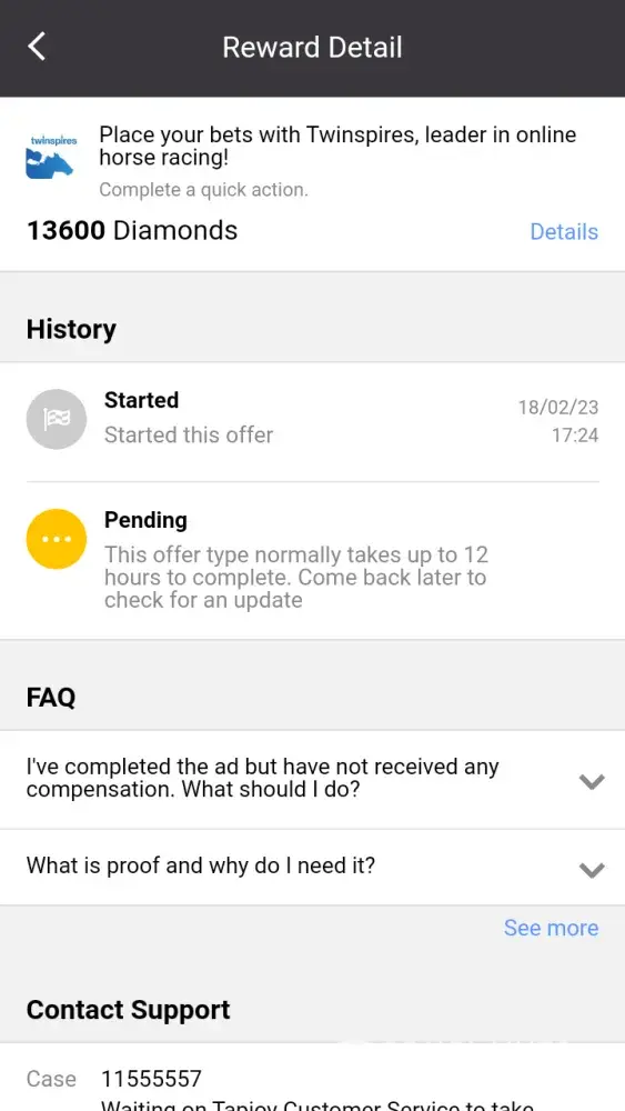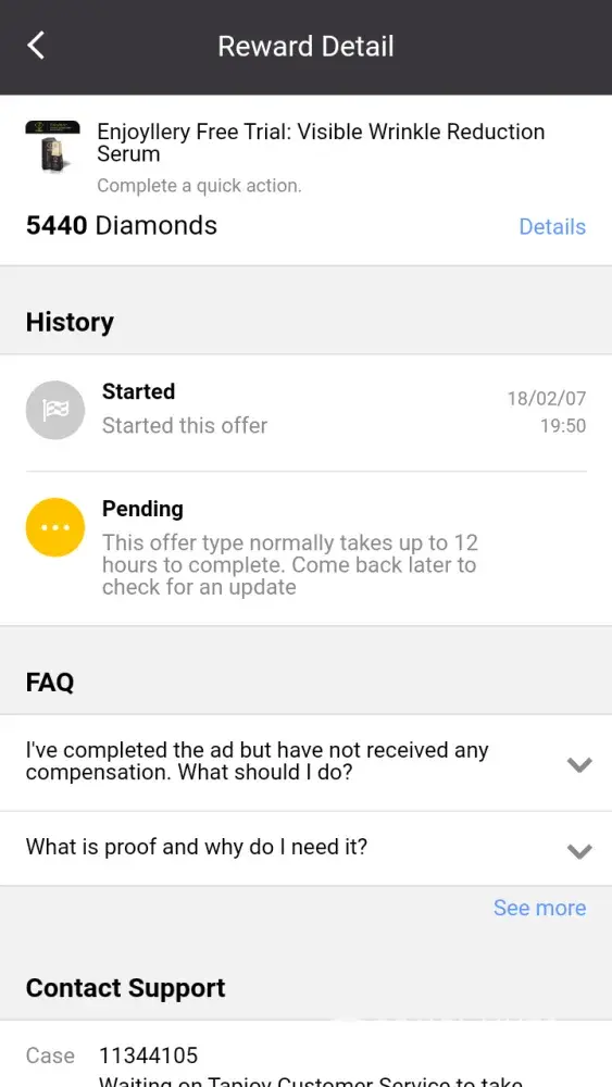 I got contacted by customer service sayimg they'd awarded me my 3570 gems. My gem amount had remained exactly the same (400+), status Pending in Offerwall. Sent in a follow up ticket, and they told me it'd been awarded a few days prior. I check Offerwall again and it now says Rewarded... But STILL no gems. Don't ever bother with TayJoy's "rewards", you'll just waste your time and effort.