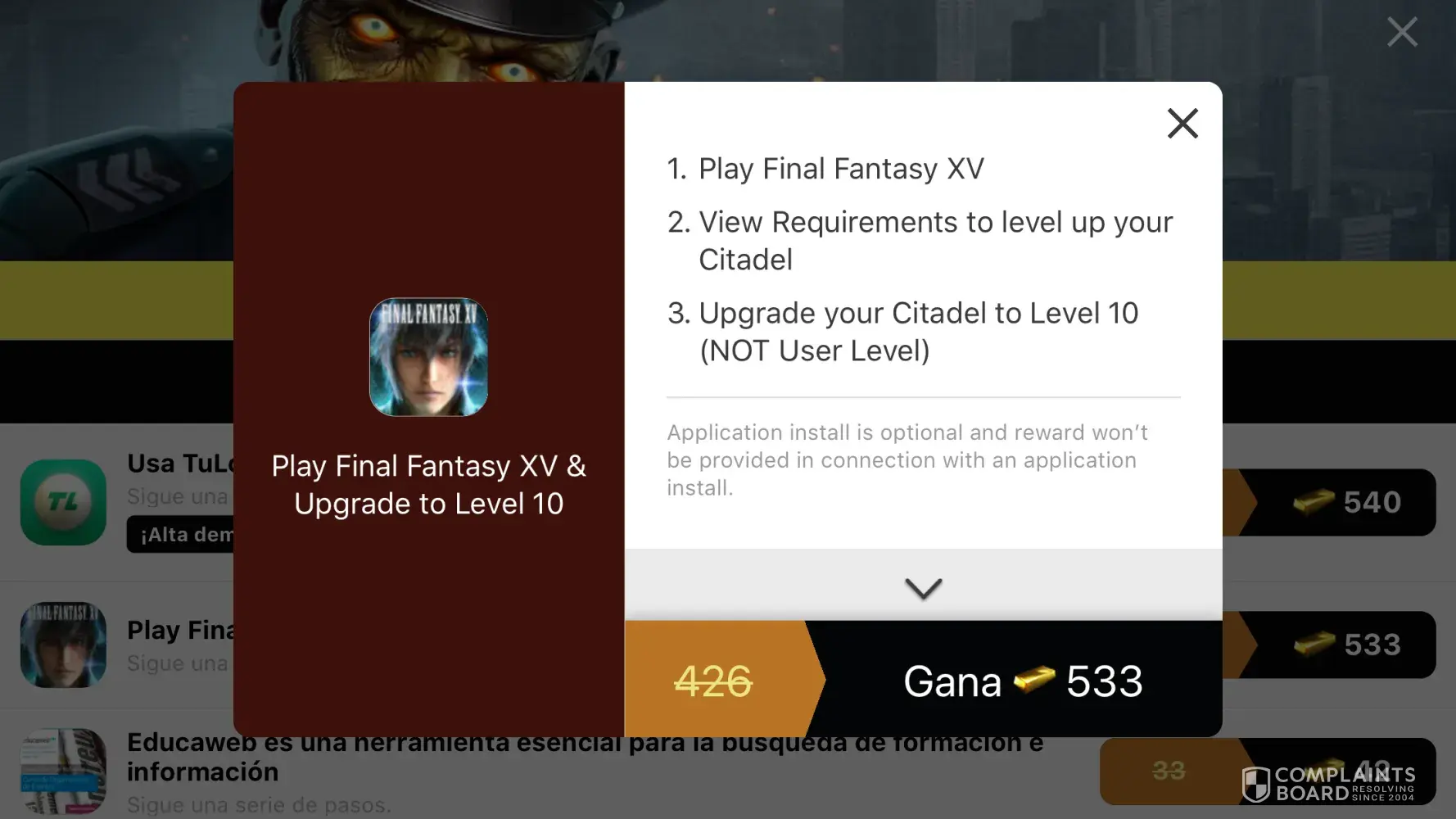 I went under my shall we date: wizardessheart+ app and went to the tapjoy to get coins. I chose the Final Fantasy upgrade Citadel to lvl 10 for 2414 points. I go nothing in return. When I tried to make a complaint it said I had no completed offers to choose from. I tried dl’ing app and it won’t let me. I want my points!