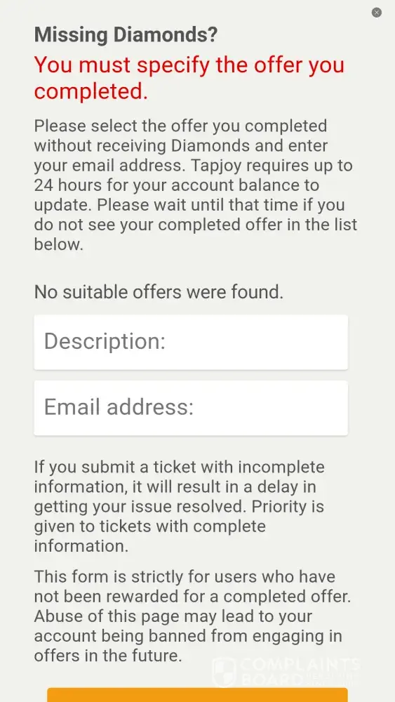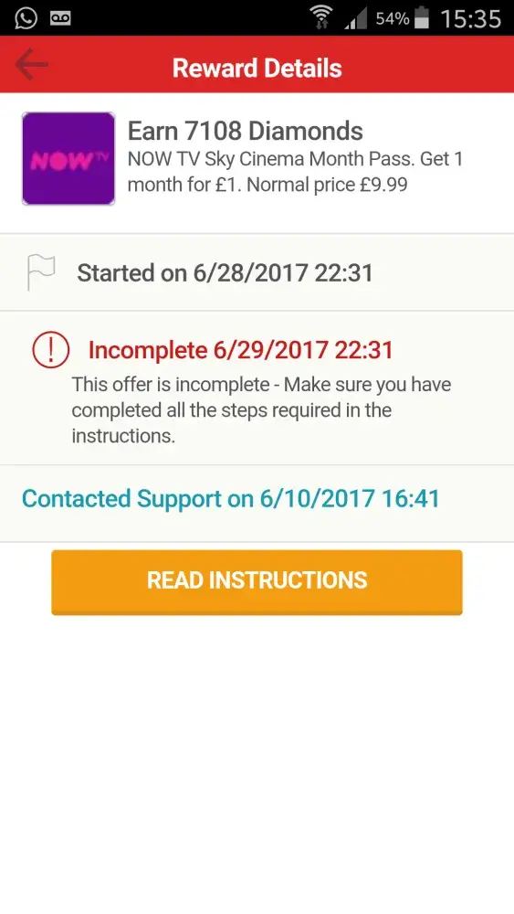 I completed an offer to get NOWTV (in UK) and after successfully doing so and real money being took out of my bank account for the offer I still have no diamonds (over 7000) and on the tapjoy app for the game it says incomplete and there is no way to contact tapjoy regarding it. I am extremely angry that I have paid money and not had any diamonds in return. I have tried up to 10 times to try and get this matter sorted with no avail. Please help me. Kind regards. Miss Tammy Hall