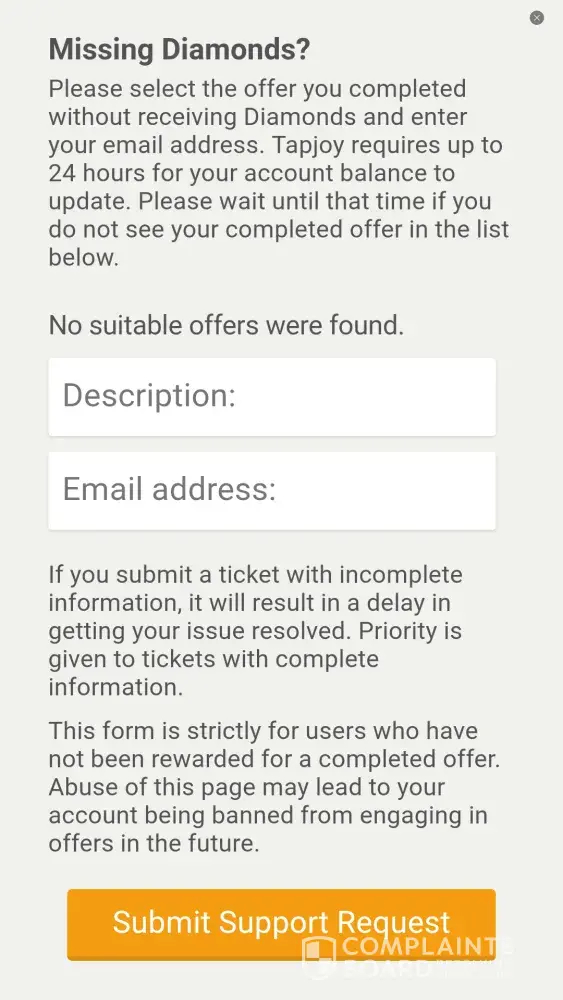 I have completed several offers with high rewards. I submit my support request and get a response to send proof. On several I have sent proof numerous times and they refuse to reply. They pick and choose what to respond to and refuse to reward despite proof. Very frustrating. I am owed upwards of 30, 000 diamonds for things that there is no question as to whether I completed. I've been patient and waited weeks, still no response. Unacceptable.