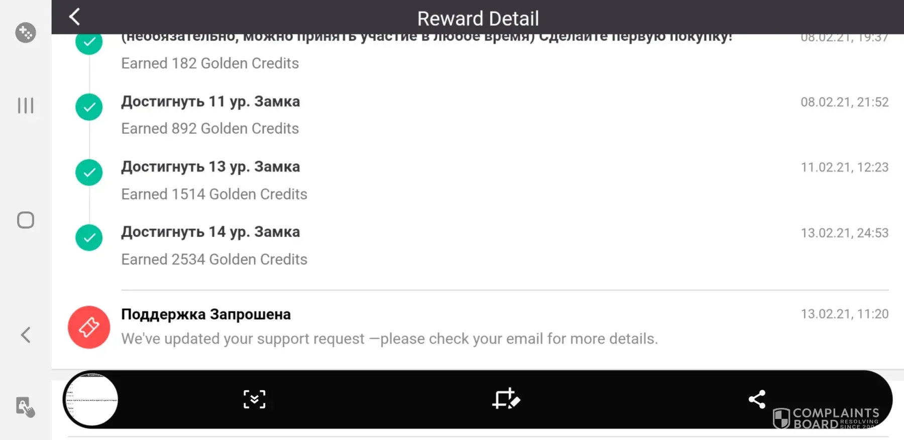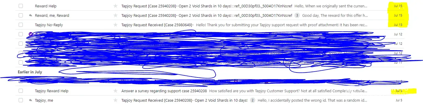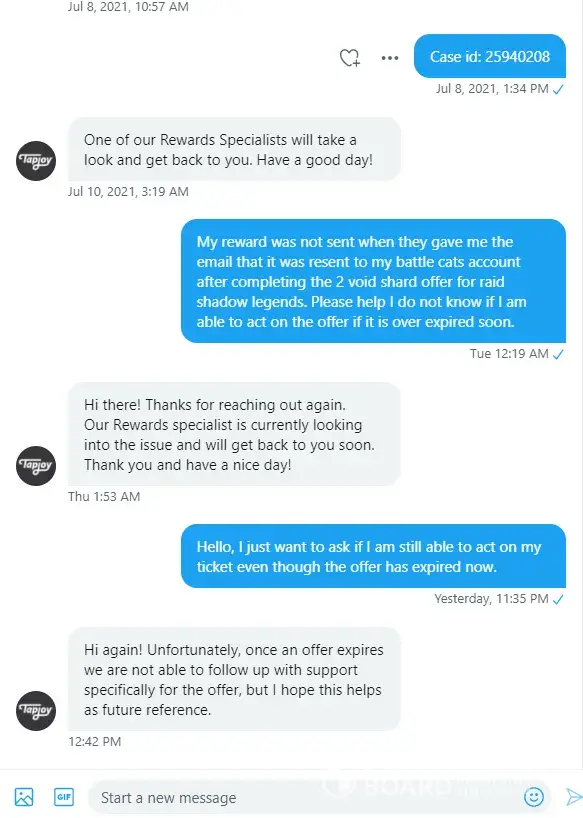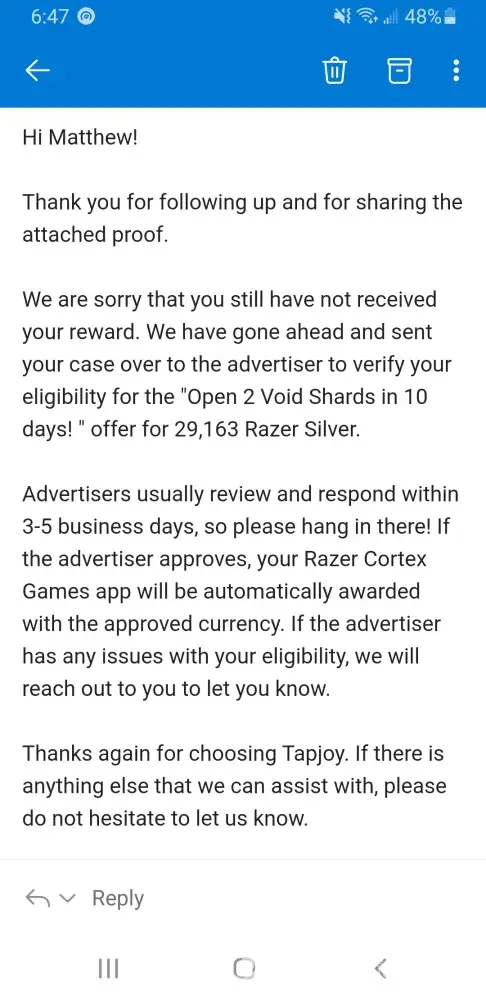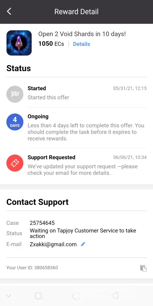 I was starting a offer called "Open 2 Void Shards in 10 days!" for Raid Shadow Legends on July the 5th, 2021 17:37. After I have completed the offer, I was given a status update saying that my offer had failed to reward me. Just a little bit after the status update, I had quickly submitted a ticket about my incident. They proceeded to give me a bot emails saying all the alternatives that may occur for my offer. A week later no response and the offer was near expired. So I went to your support twitter account '@TapjoyCS' and they helped me the best they could. They were able to get me an email from the support telling me that they would give me a reward on July the 15th, 2021. That email was the last email I received from them saying they had resent the reward, but I have yet to see it to this day. Shortly after the offer expiring, I was left with no reward and just feeling anxious throughout the whole case. I am very displeased with the little feedback I was given from support and I certainly hope something will be done.