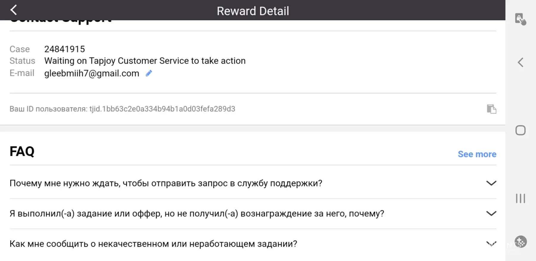 Служба поддержки tapjoy уверÑет что вознаграждение выÑлано, Ñ…Ð¾Ñ‚Ñ Ð¿Ð¾ факту Ñто не так.Мой имÑйл [protected]@gmail.com