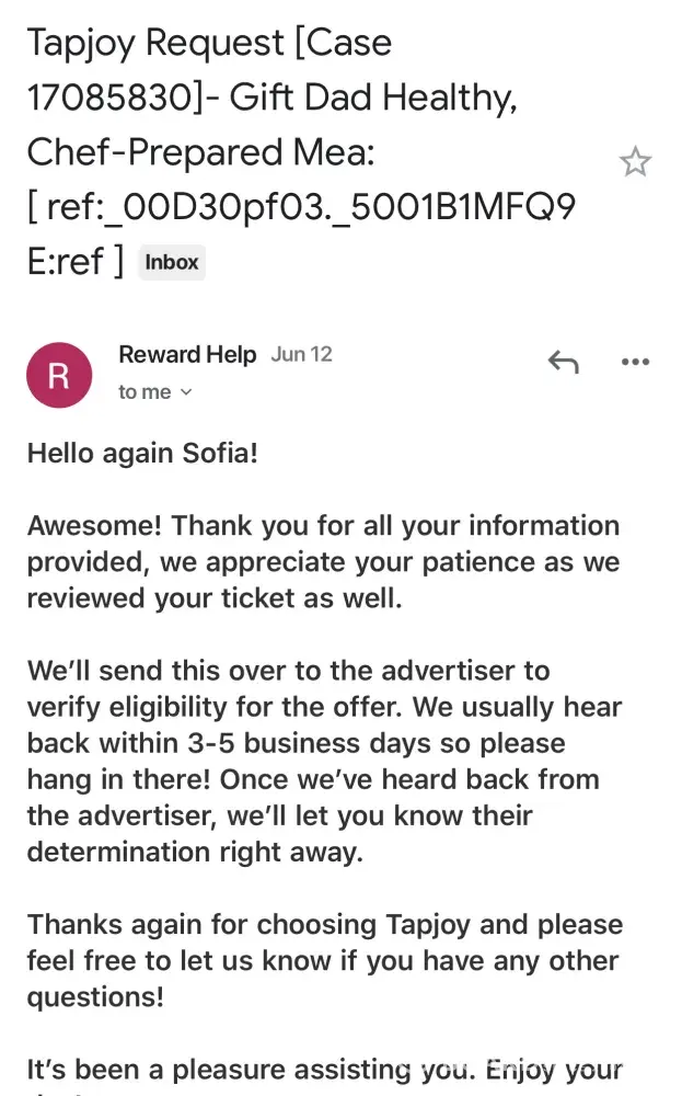 I completed an offer for diamonds buy buying RealEats meal subscription. After competing offer, my diamonds didn't appear. I waited the 24 hours and submitted complaint. Tapjoy responded asking for screenshots which I sent immediately. They said allow 3 days to get verification from their advertiser. It's now been 7 days since the completed offer and Tapjoy no longer responds to my emails.