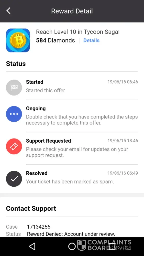 So I completed an offer, three, actually, and only got rewarded for two. The third never got credited to my account, despite me having all the evidence to prove that I completed it. I've tried to reach out via Twitter and no response in the last few days. When I went back in-game and tried to submit another request ticket, it said that my request was marked as spam and my account this under review. I can't get ahold of anyone there, and this is frustrating beyond belief because I spent money on a different app to complete this offer.
