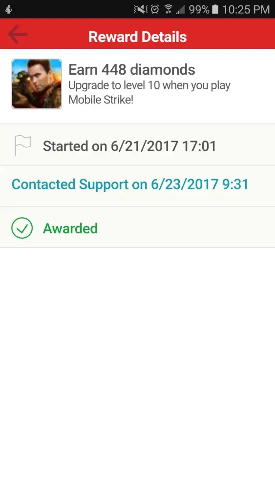 I completed the offer i never receieved my diamonds in game, i filed a lost diamond report my email is cv93ny@gmail.com i also sent screen shots of my level in mobile strike if u may can u please contact me as soon as possible so i may recieve the diamonds in game i am very dissapointed.