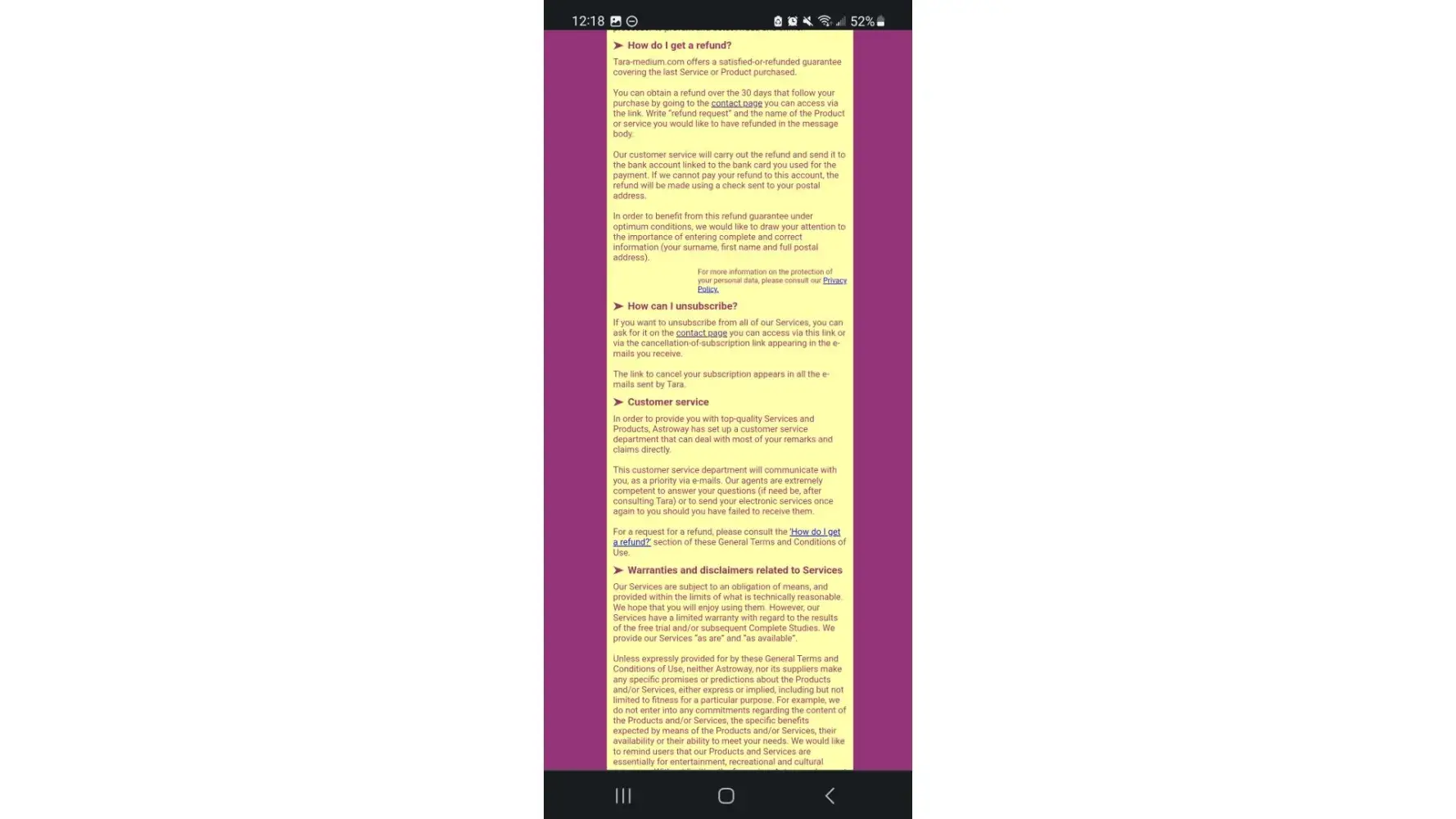 I visited the Tara visionary medium website and got a free reading, following this I purchased an in depth reading from her with the promise that if I was not fully satisfied I would receive a full and fast refund, no questions asked on request. I never received the reading. I never received a response to a refund request sent over 4 times to her listed email address: [protected]@taramedium.com