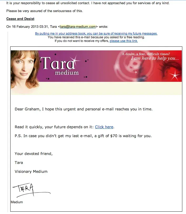 Tara the medium is a scam and really upset that she has not had her site closed down by now . How do we go about this? I got ripped of by her yesterday and have now read many comments from others explaining the same thing! She sends emails everyday to the point that she scares you and you eventually give in a give her money for nothing.
