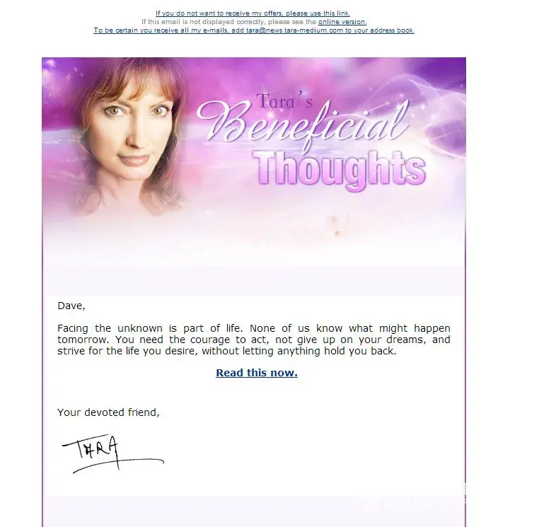 I cannot remember when or how I started receiving emails from "Tara". What I do know is that they were well written, persuasive documents which always seemed to promise the world. At the time I was going through extreme financial hardship and what she was saying seemed to be fit in with what I was experiencing. I was fooled, once, into parting with A$20 for some lucky numbers (as I recall) but all I got was a bunch of numbers and a link to a web page which attempted to suck another A$20 out of me so I could see how to use the said lucky numbers (WTF?!?). Alarm bells immediately rang and I closed the website. Also, I'm glad I didn't take her advice; I checked all the lotto draws in Australia for a month or two after receiving them and I don't think I'd have won a cent using my "lucky:" numbers. She got her $20 for nothing, it really ### me that I still get these emails every day; still making the same ridiculous claims. Anyway, sounds like I got off lightly compared to some others on this site.