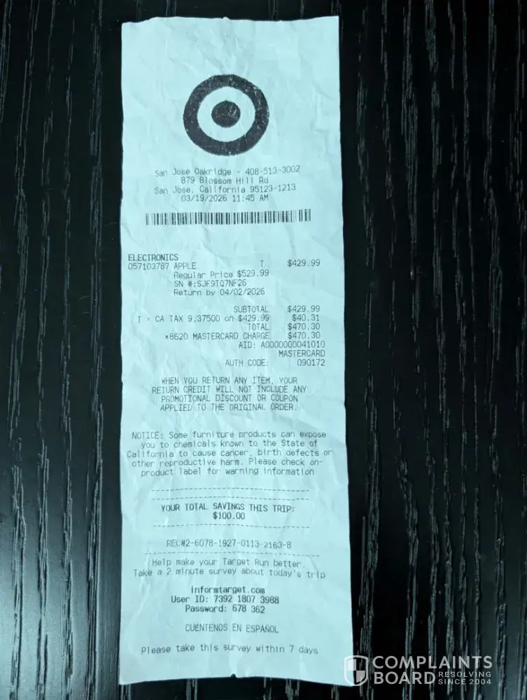 I visited the Target physical store at 879 Blossom Hill, San Jose Oakridge and noticed an Apple Watch Series 11, 46mm, GPS + Cellular, advertised for $429 - a regular promotional price for that model (the same price I had checked on Amazon at https://www.amazon.com/Apple-Watch-Smartwatch-Aluminum-Always/dp/B0FQFJ2G7R/r). I asked the store rep to bring me...
