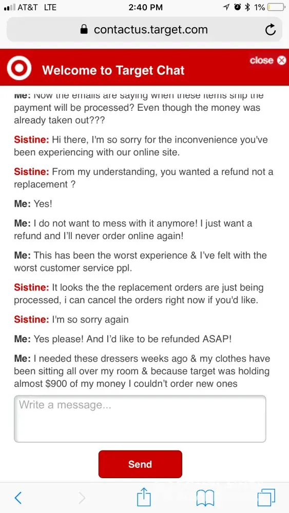 I placed an order #[protected] on Oct. 7th totaling $887.21. They were shipped on Oct. 11th and the money was deducted from my bank account. I received a call from EFW shipping saying they received the items damaged, and they were sending them back to target and I would be issued a re-order. I even contacted target.com to make sure this happened. As days passed I never received any updated information on my order or shipping of these items. I called Guest Relations to find out what was going on. They said it looked like they were having technical difficulties and could not tell me anything further. I then received an email saying my items had been delivered, which they had not, I contacted everyone in my neighborhood to make sure they were not delivered to them by mistake. They were not. This then leads me to call again, where I was told it was a technical mistake. A week goes by and still no update. I needed the dressers the week before so I called to submit a refund request. I was told they would submit my request and receive a call from a supervisor within 24 hours to discuss my case. No one ever called. I continued to call day after day for the past 2.5 weeks to figure out why I hadn't been issued a refund. I was given the same answers by everyone I spoke to wether it was the online chat or guest services over the phone. I was told I'd be contacted via phone by a supervisor or via email by the ORT team. This continued to not happen. Today is Oct. 30th and I put in my final attempts to get my money back. I chatted with a representative who actually lied to me and told me my order was refunded back to my RedCard and I should contact them. I stayed on this chat while I contacted the RedCard guest services. I called the chat rep out on lying and she asked that I give her some time to further look into my case. Then told me that the ORT team had my case and would be the ones resolving it. I have been lied to over the phone or through chat help several times over the past 3 weeks. I was offered a $20 gift card and then a $50 gift card for my frustrations but never a refund. I am sure you can go back and look through all the notes from the calls I have made and the chats I have held with target guest help. I wish the calls were recorded and if they are you will be able to see what a poor job these people are doing. The only person to finally help me was a lady that I reached through the RedCard Services. She went ahead and pushed the refund on her end and was going to contact the ORT team to make sure they didn't also issue a refund. But I was only able to speak to RedCard services today by finding the number myself online. No one from your guest services had ever offered up their contact information. I will absolutely never be shopping online through Target.com again. This experience was horrific and time consuming. The issue should have been fixed after the fist call. I have read Target's mission statement and what I experienced was the furthest thing from it! I have spent hours of my time away from my family and work trying to contact people to resolve my issue. Target should have been the ones working diligently to fix the problem. Instead I was lied to and mislead for 3 weeks!