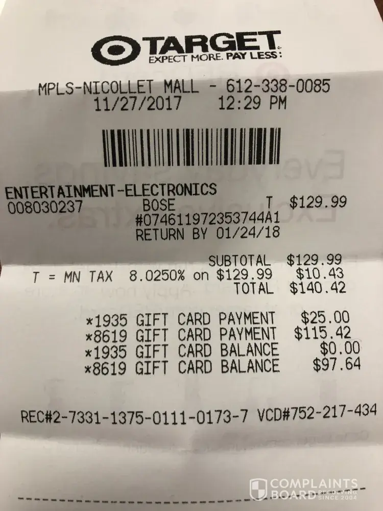Good morning. I paid full price for the product listed above yesterday at the Nicollet Mall Target store. When I opened the product, it was clear that it was purchased by someone else and then returned to the store, for whatever reason. Thus, a used product was being sold as if it was new. The speaker itself was dirty, and based on my use of the Bose Connect app, I could determine that it had been linked to two other idividuals iPhones. I was able to clean the product and clear out the other individuals bluetooth connections; the product seemingly works fine. However, I do not like the fact that I paid full price ($140.42) for a used product. Expect less. Pay more.