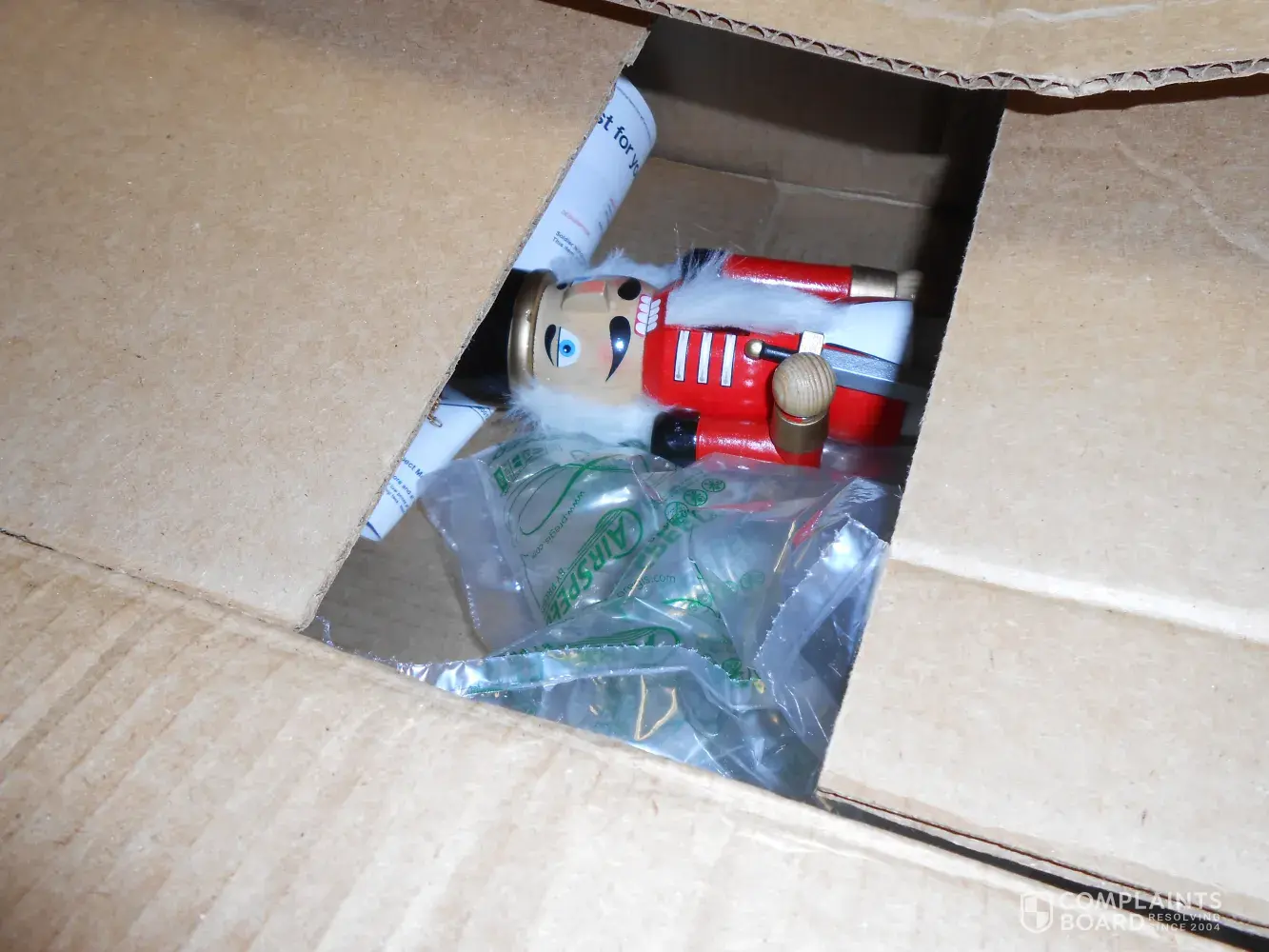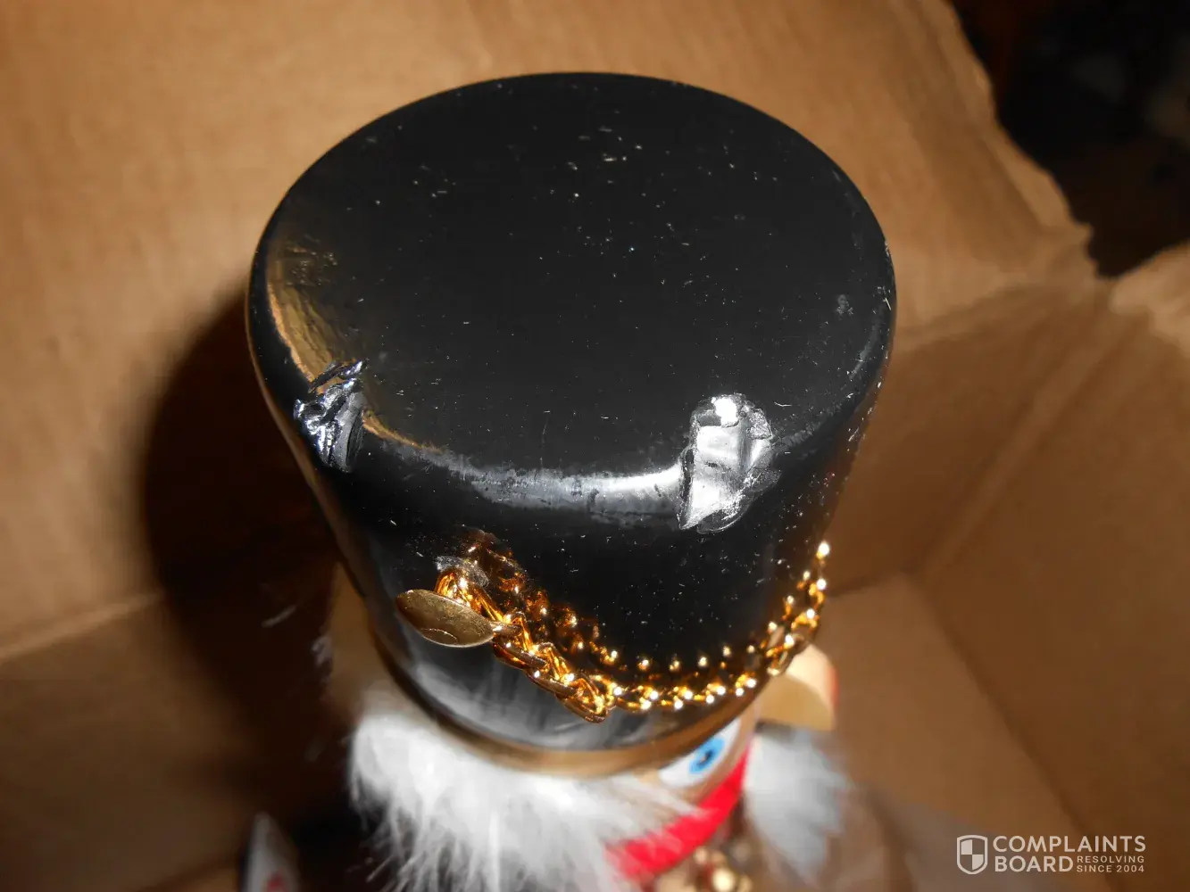 ORDER # [protected] - Placed 12/01/17 - received 12/07/17 --Ordered this Nutcracker figure online to avoid traveling miles to the store etc. It arrived in a very large, damaged box, the item loose and had banged around the whole trip obviously, with about a yard of "plastic air pillow packing" with mostly NO air in it and it was laying to the side of the item. No attempt to protect the item was made. Needless to say, the figure was damaged and broken. Because of the outside condition of the box and the noise inside, I took pictures during each stage of opening.