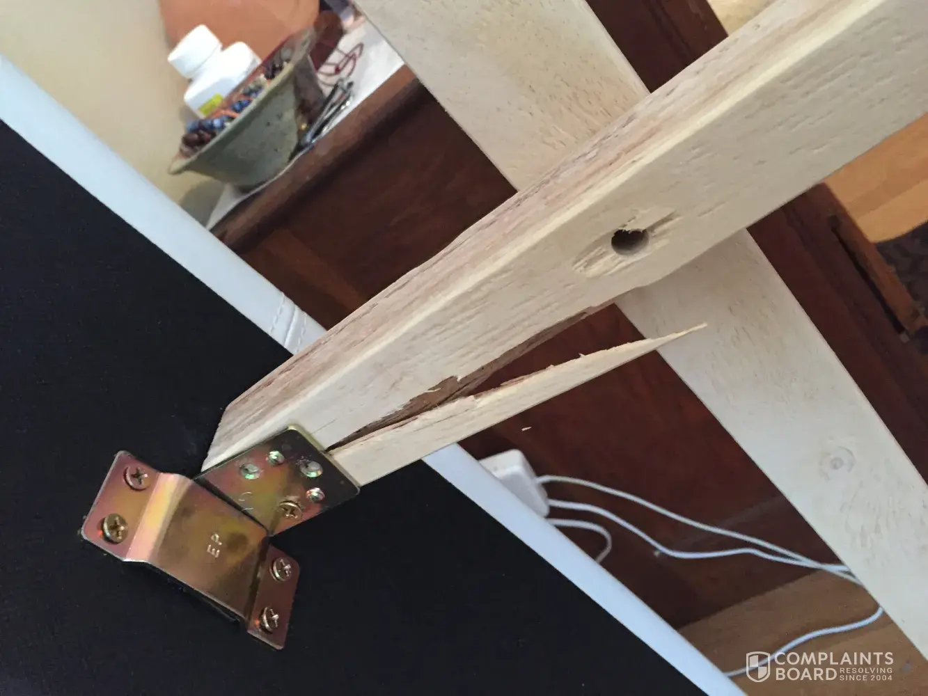 I bought this frame a year ago to be used in my guest bedroom. I am enclosing pictures of how the frame shattered along with the several of the slats after use.