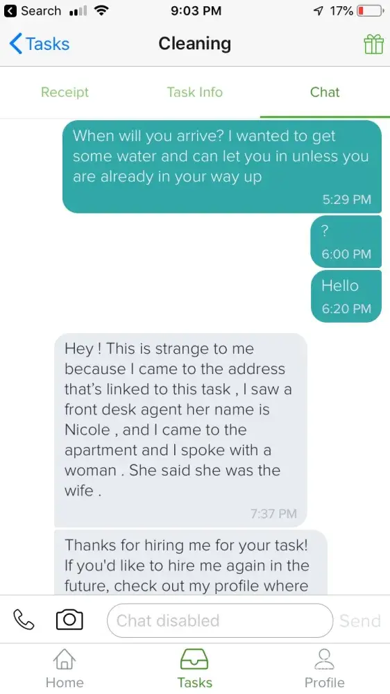 The person did not show up to the appointment but had the audacity to say that she was there and cleaned and that she was let in by a female whom she assumed to be my wife but never asked for the name. I was there the entire time waiting for the person. I was charged non the less and would like my money back. Furthermore, I've contacted taskrabbit and they said they would attend to me in 2 - 3 weeks. I feel helpless and though I've been fooled and probably tricked by someone who does this strategically.