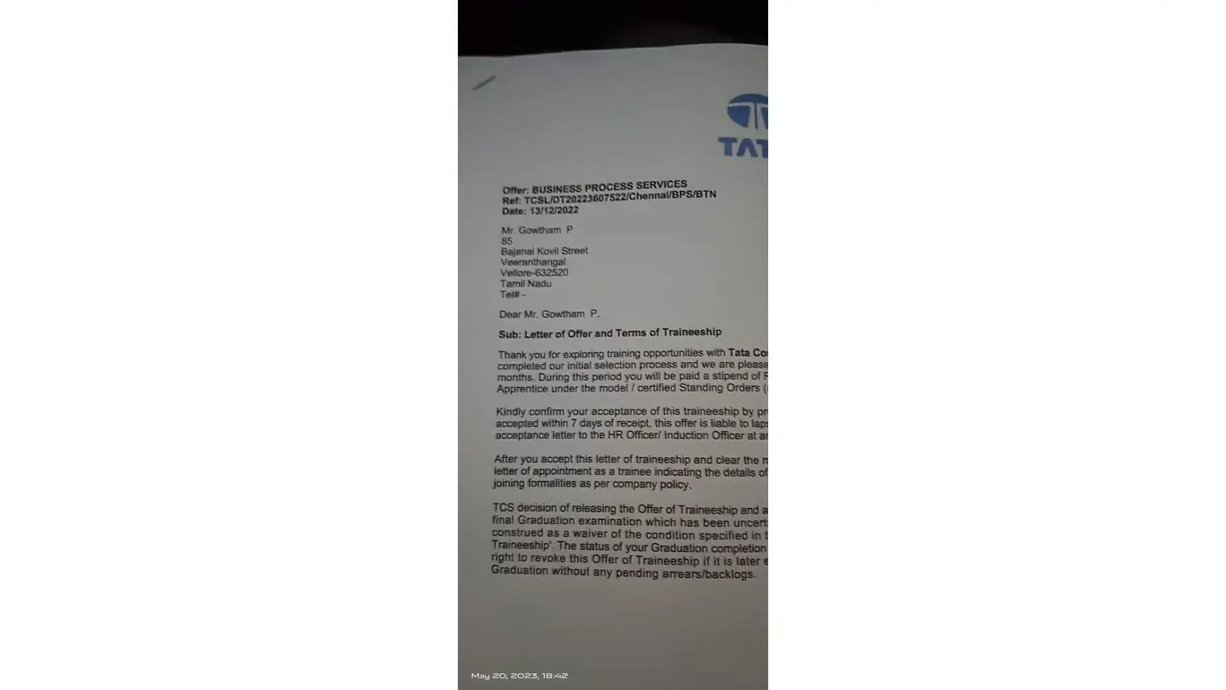 Ref : TCSL/dt20223607522/Chennai/bps/BTN