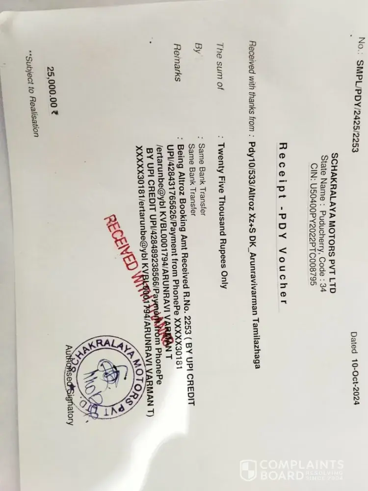 Dear Tata Motors / Schakralaya Motors, Pondicherry, I hope this email finds you well. I am writing to formally request the refund of my booking amount for the Tata Altroz, which I booked on 10th October 2024 at your dealership, Schakralaya Motors, Pondicherry. After careful consideration, I decided not to proceed with the purchase and informed your sale...