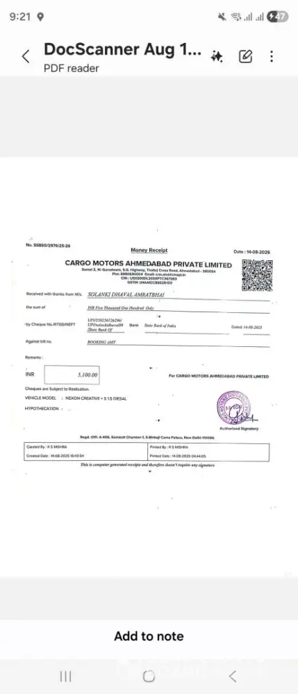 I booked a Tata Nexon car on 14th August 2025 from Cargo Motors, Ahmedabad.