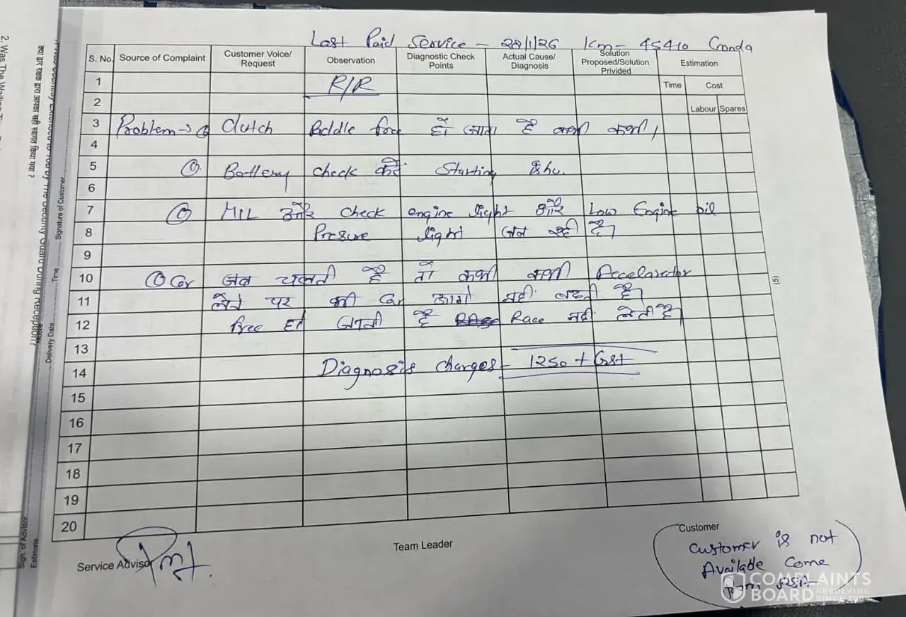 Respected Sir/Madam, I submitted my vehicle — a Tata Nexon iCNG — to your facility on March 20, 2026. After conducting a diagnosis, you noted complaints regarding the battery, clutch, brakes, and starting mechanism, and charged me ₹1,250 plus GST for the service. However, when the vehicle was delivered to me on March 25, 2026, you had addressed only...
